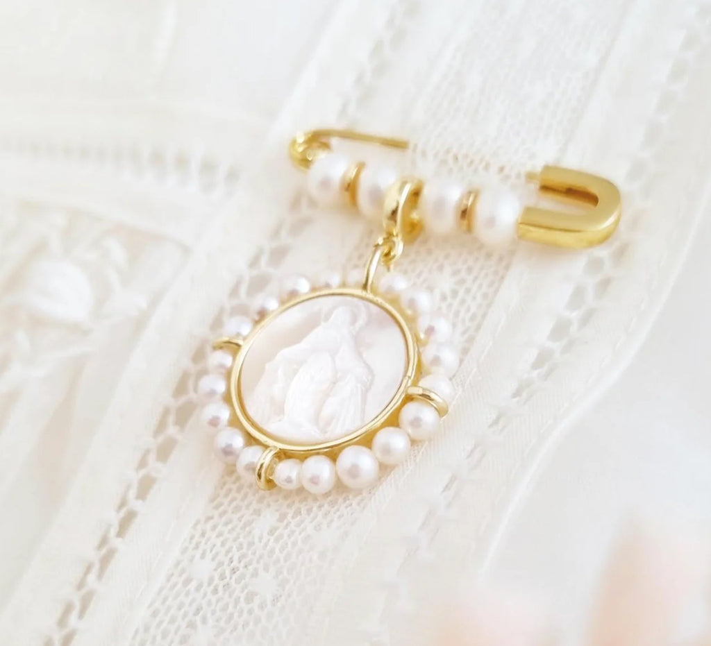 Protect your little one with the delicate and elegant Glory Baby Pin. Inspired by the Virgin of the Miraculous Medal, this pin is perfect for baptisms, first communion, or as a special gift.