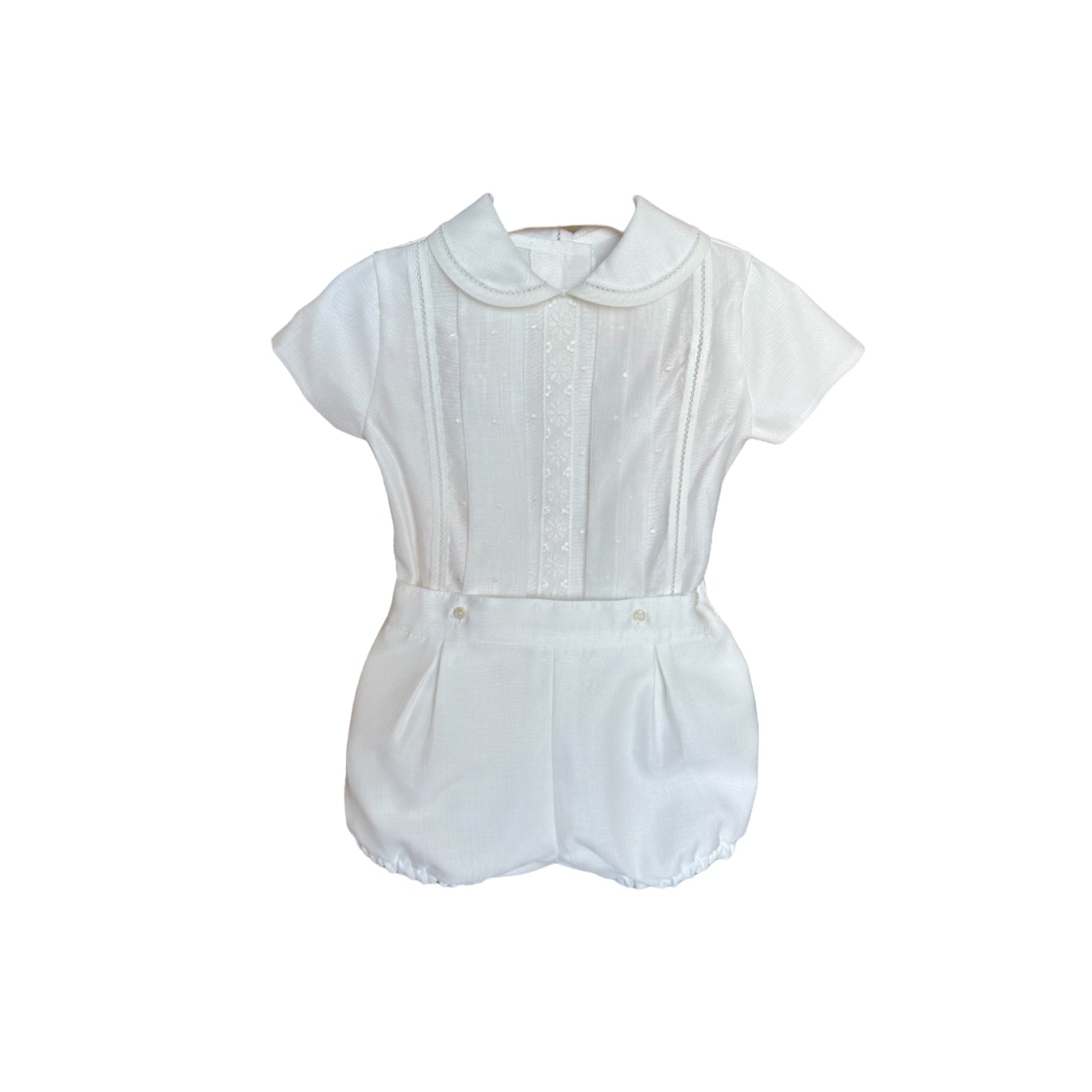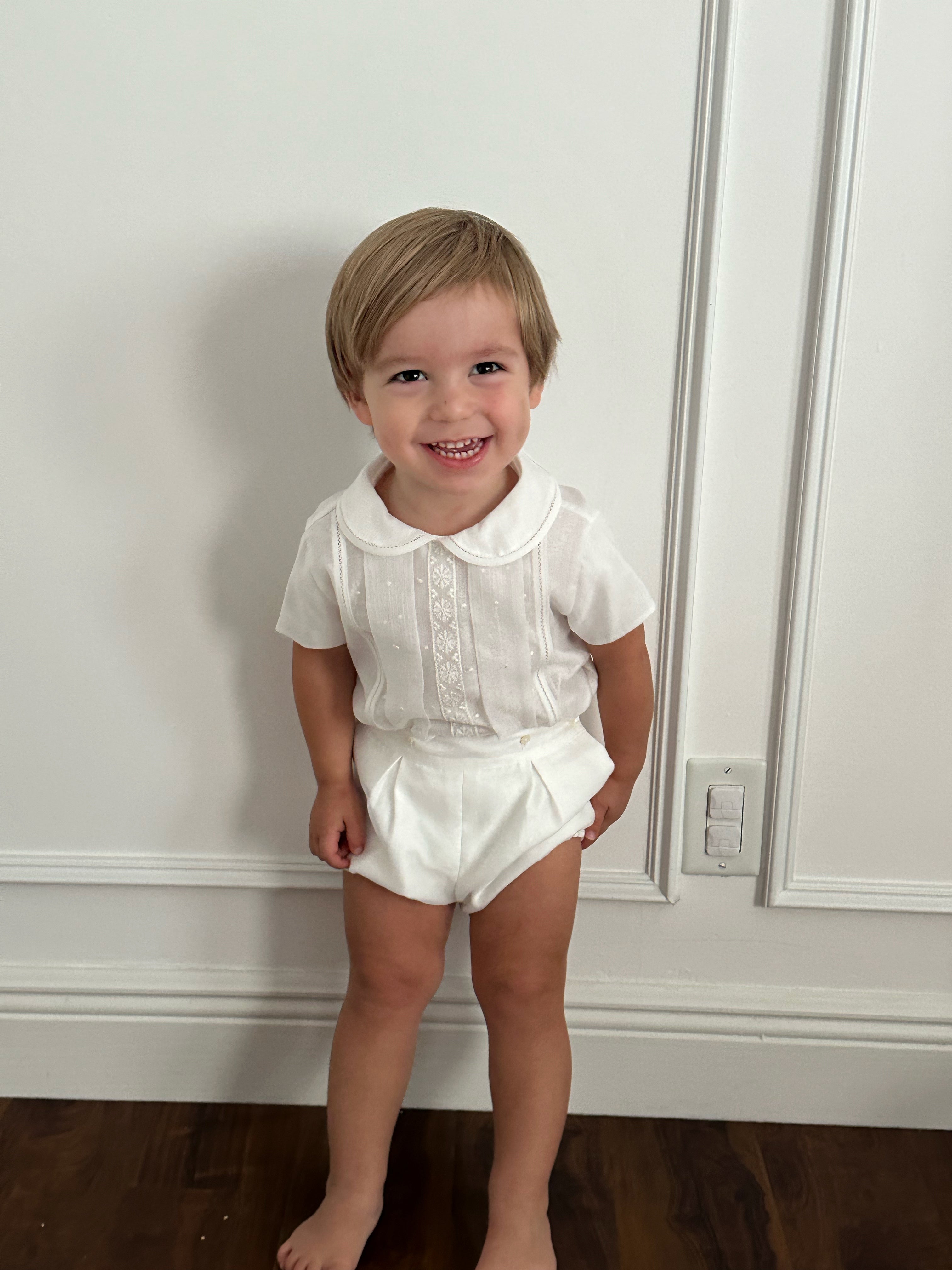 Beautiful regal two-piece set for boys, designed to create a princely appearance that will have heads turning! This set features a stunning white shirt with a Peter Pan collar and intricate detailing, paired with matching white shorts that connect with two buttons for a secure and polished look.