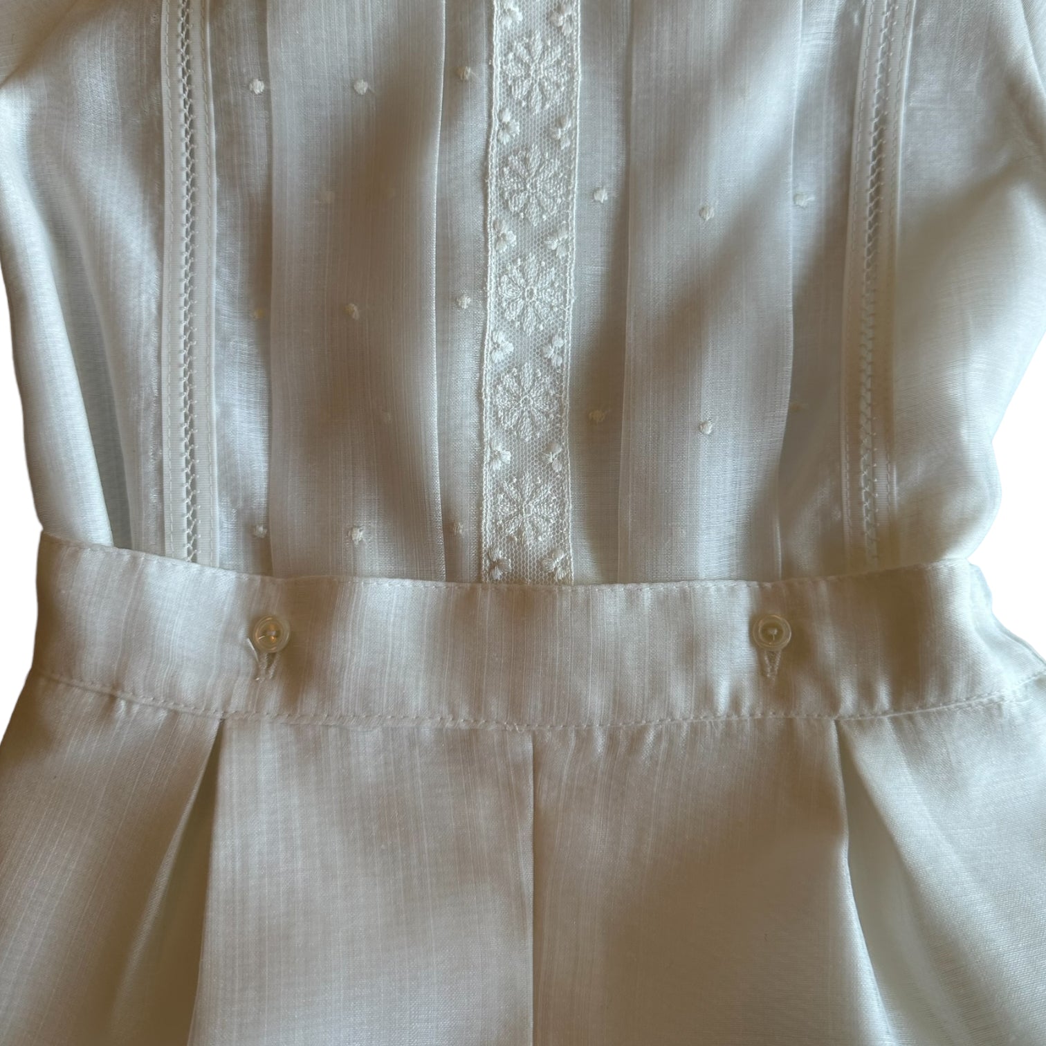 The white shirt features a swiss dot fabric and vertical panels across the shirt to create a sleek and polished appearance, while the Peter Pan collar offers a classic and timeless look that exudes royalty.