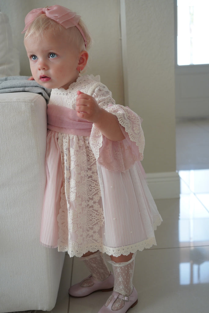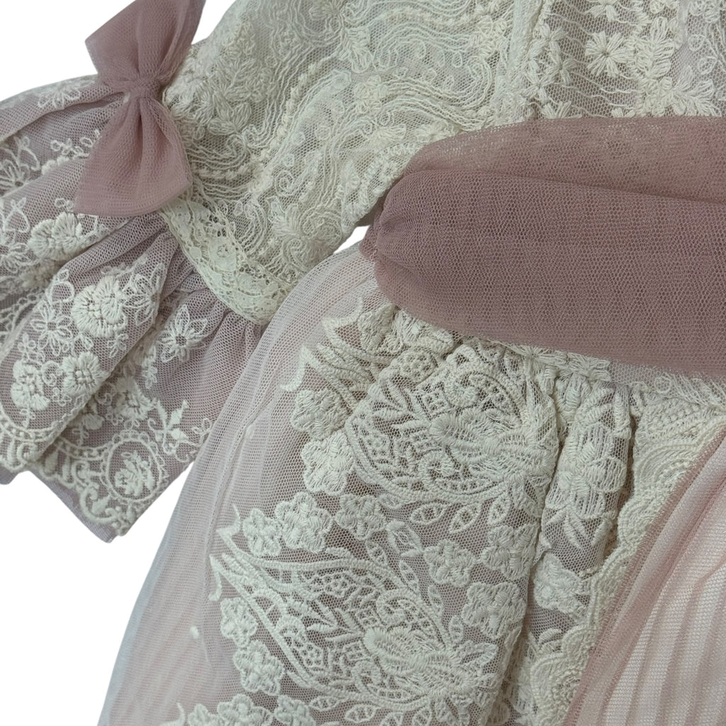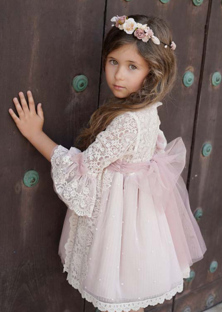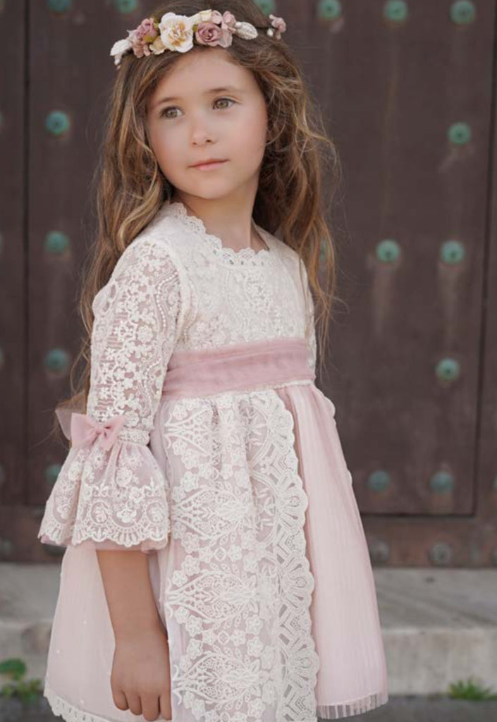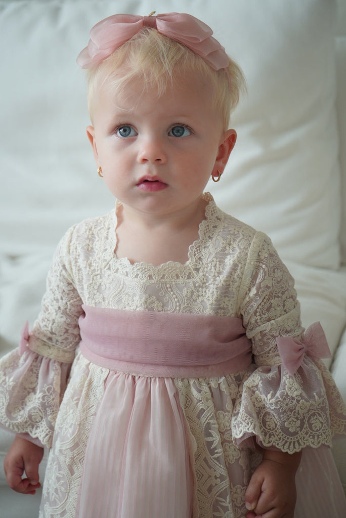 Princess dress 🫶🏽 Stunning and regal dress for girls in ivory with accents in pink.