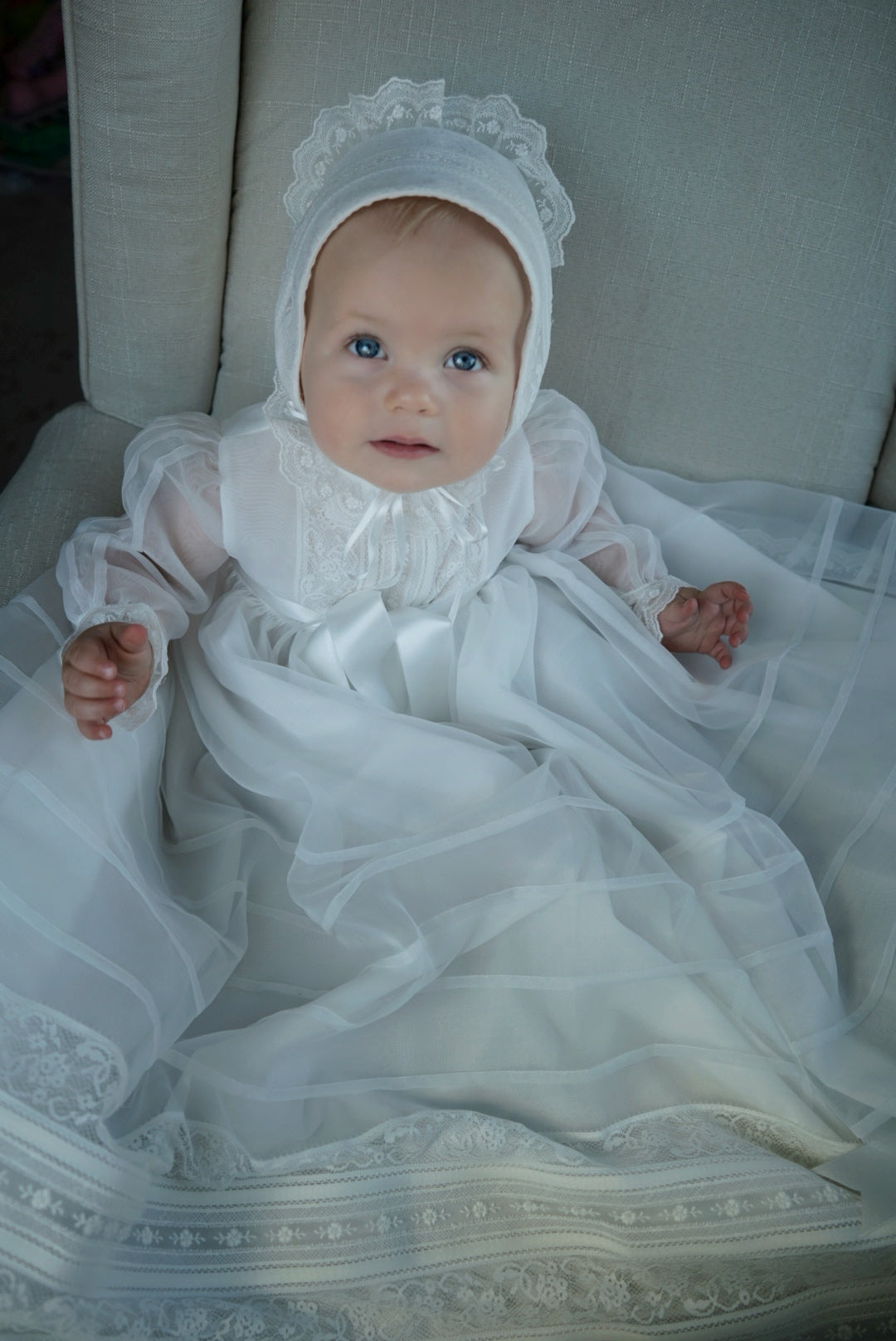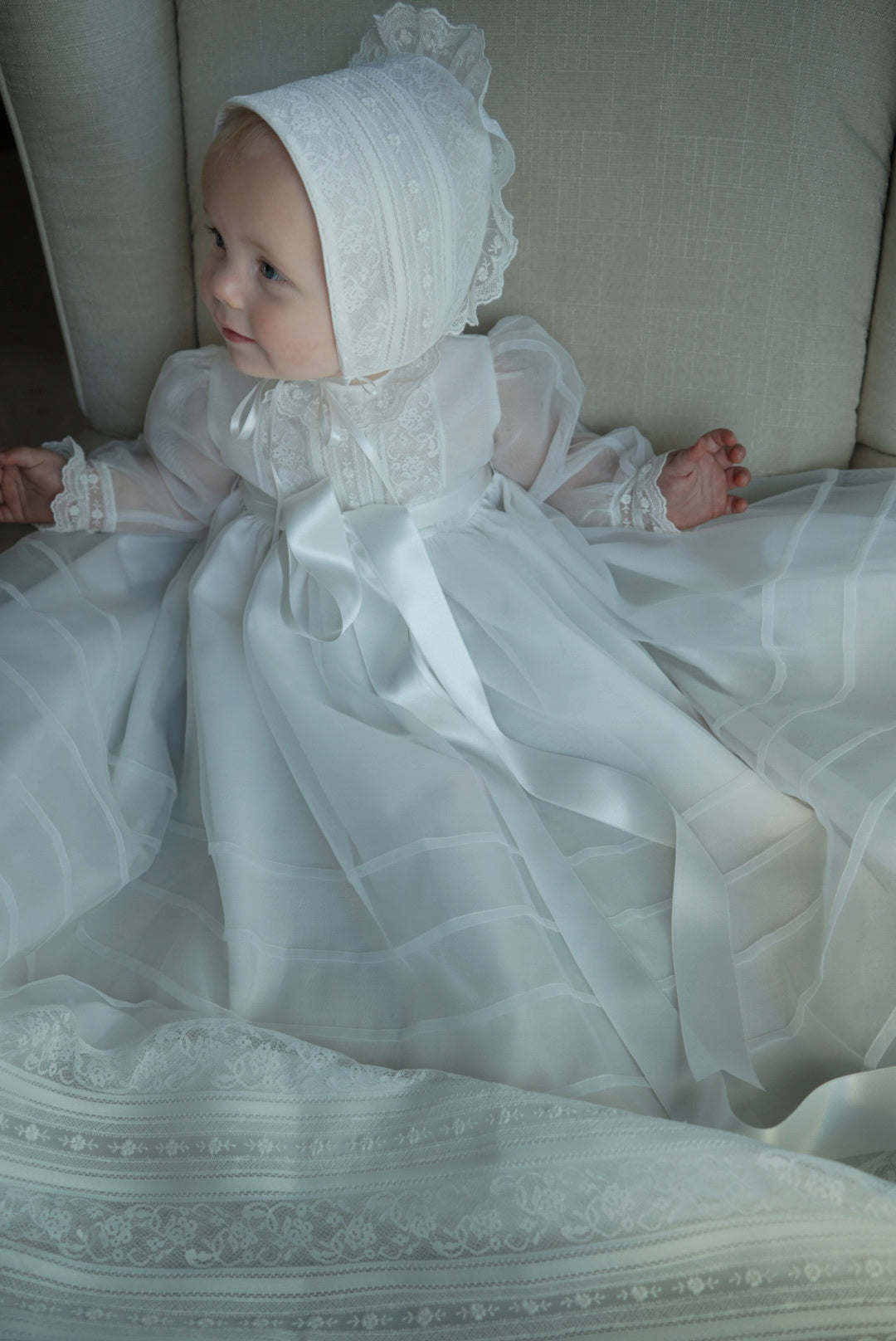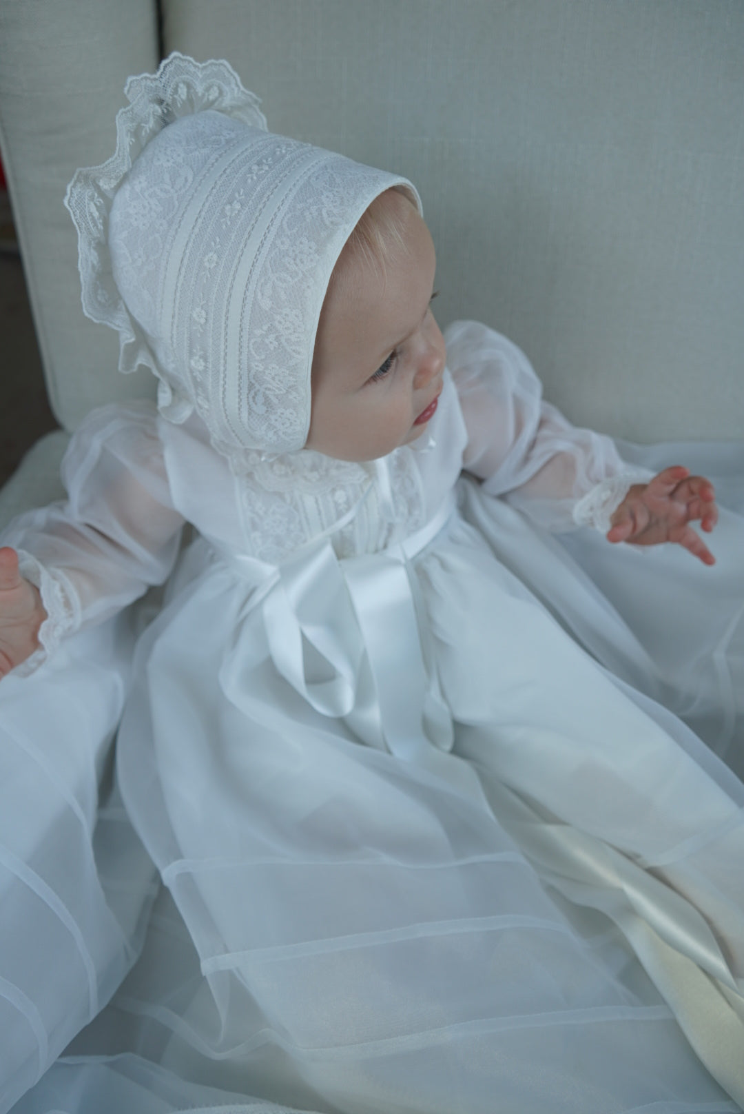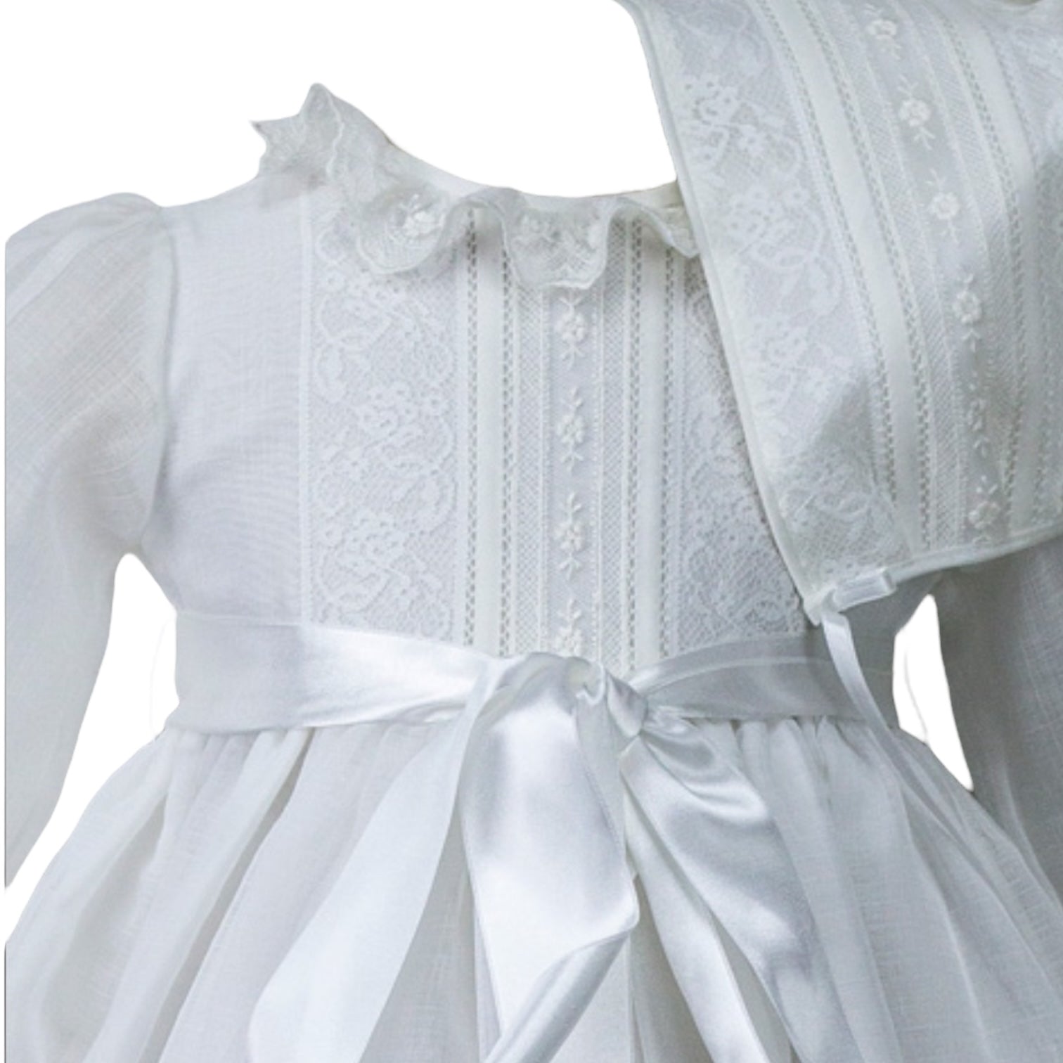 Introducing our latest addition to the Gustava collection - the stunning off-white lace baptism gown! Made by talented artisans in Spain, every aspect of this dress has been meticulously crafted for the perfect blend of elegance and grace.