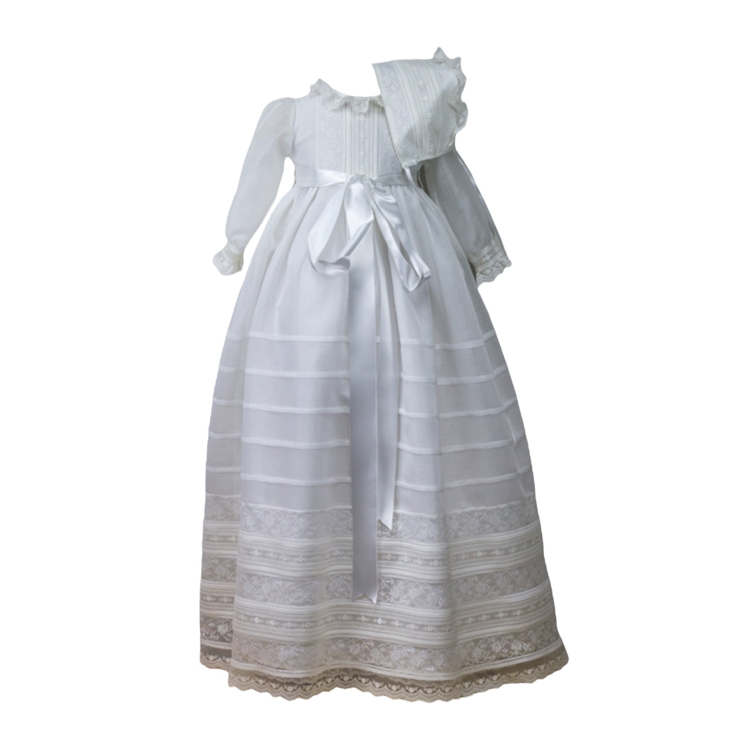 Accompanied by a matching bonnet, this unisex gown offers a comfortable and secure fit with its front ribbon closure and two white sashes.