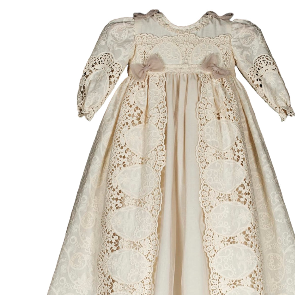 The subtle camel accents in tulle add a hint of timeless refinement, making it the perfect choice for any special occasion. Complete the look with the matching bonnet and your daughter will surely be the center of attention with this stunning gown.