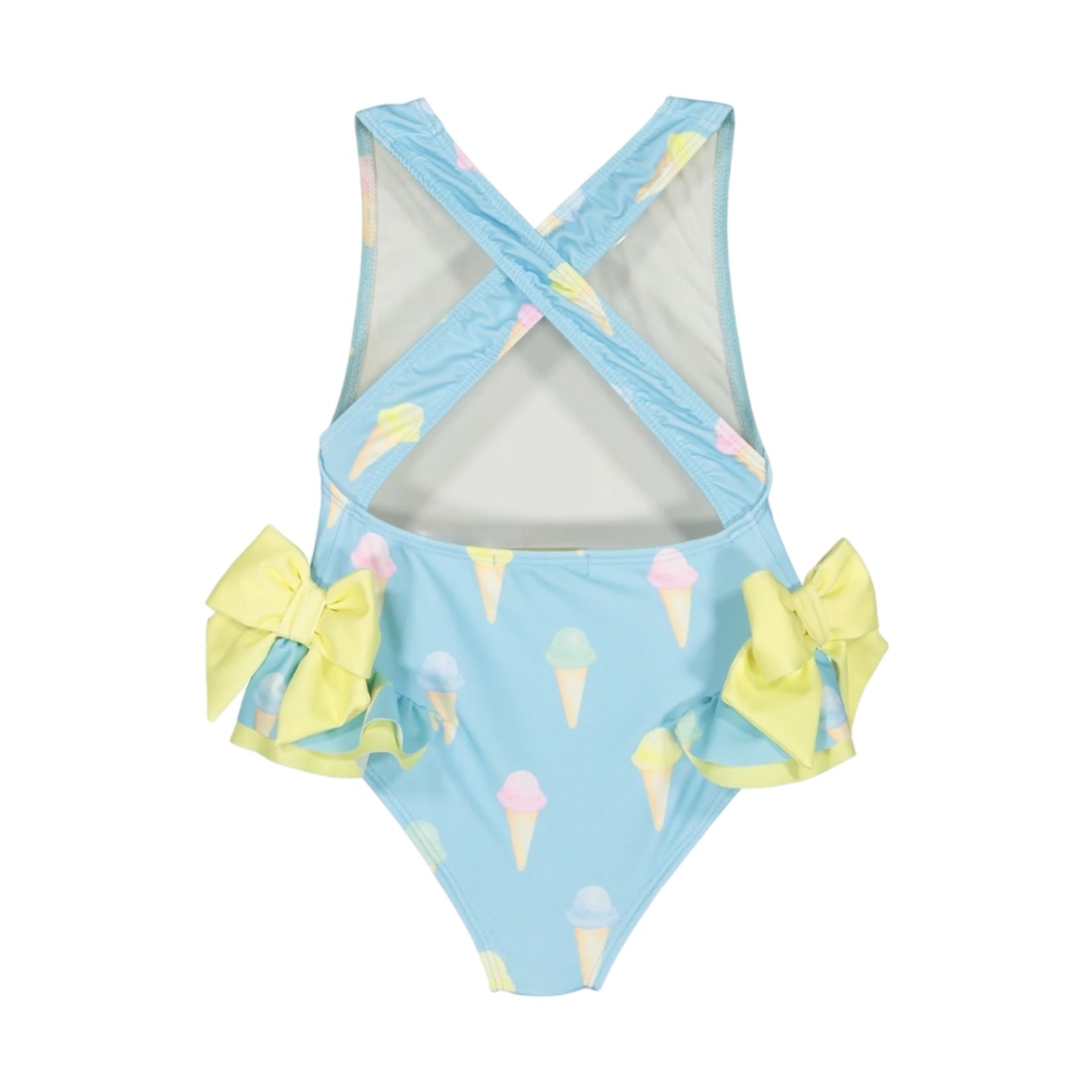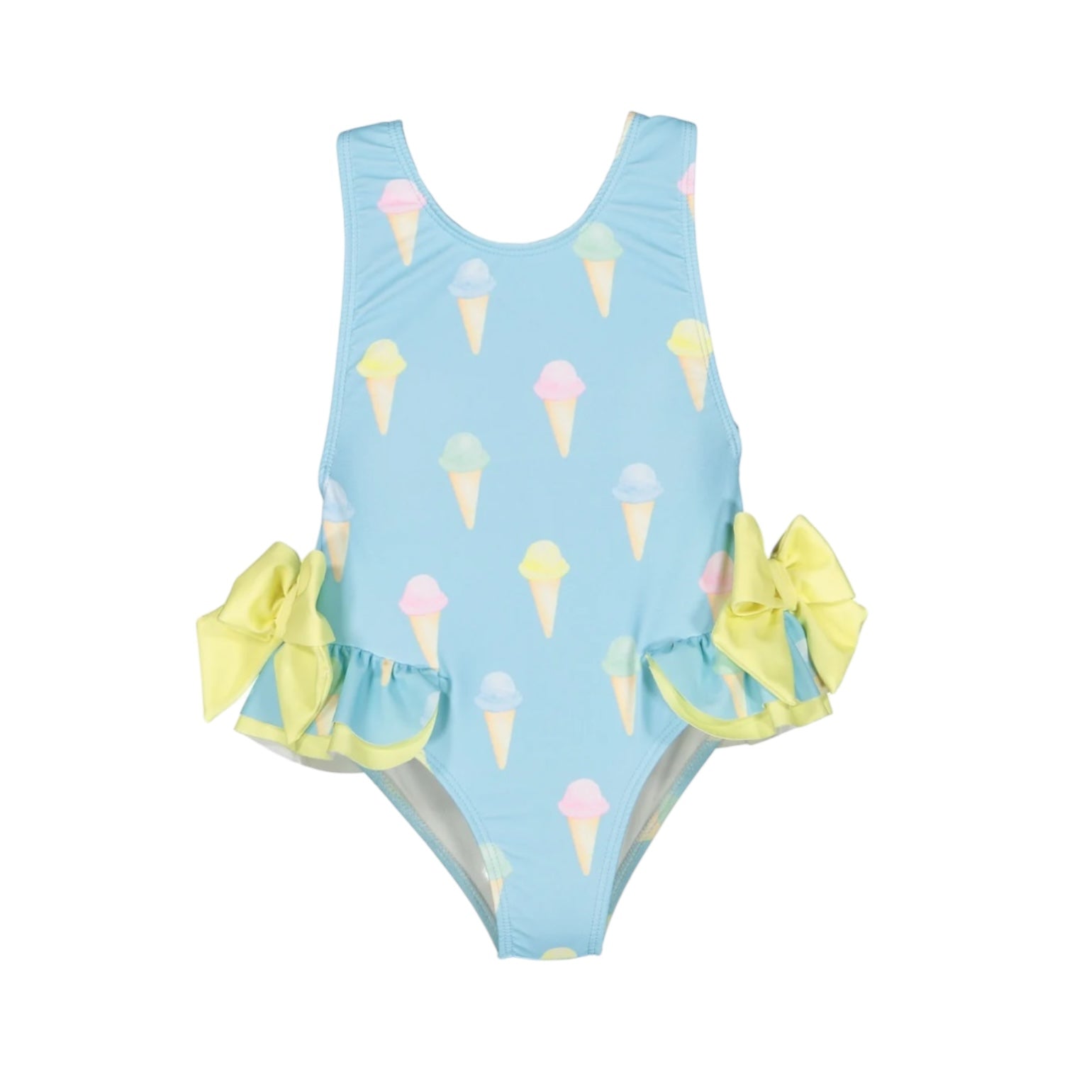 Stunning swimsuit made with a super cute lycra fabric featuring adorable icecreams and has a bow on each side.