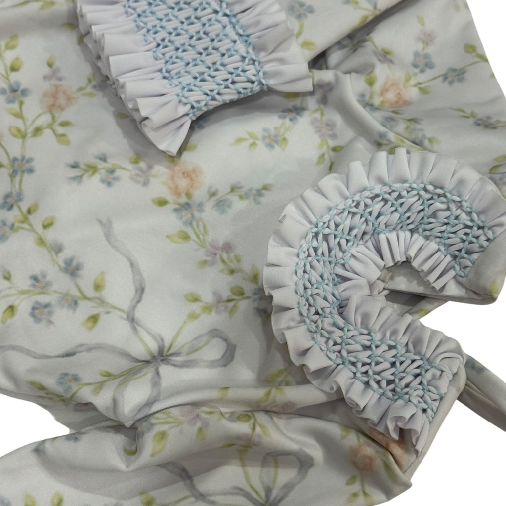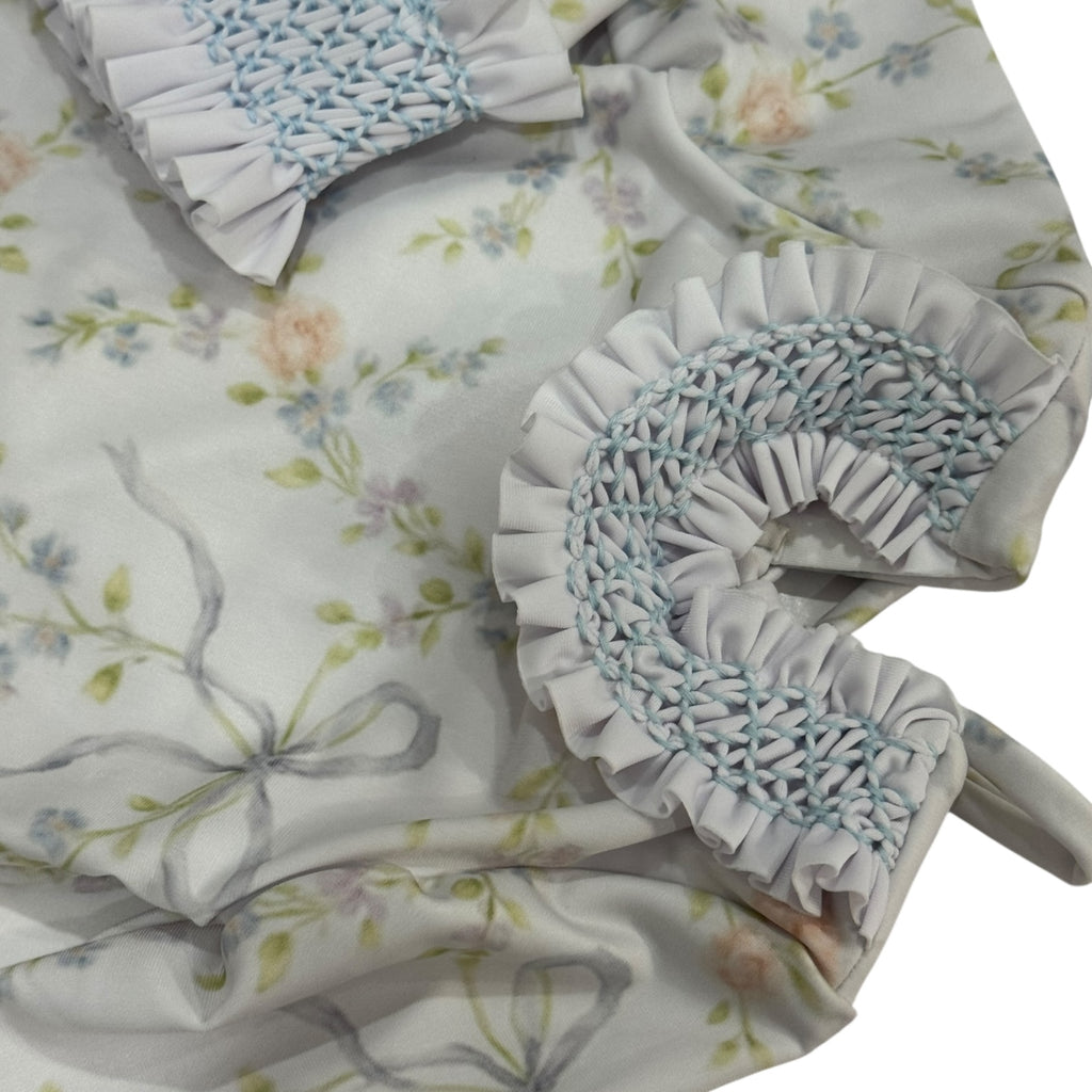 Our love for rashguards, dainty patterns, and handsmocking in a single piece. The smocking in the sleeve ends and neckline is done entirely by hand by Nicaraguan artisans. This stunning fabric features flowers and bows, the smocking is done in contrasting blue.
