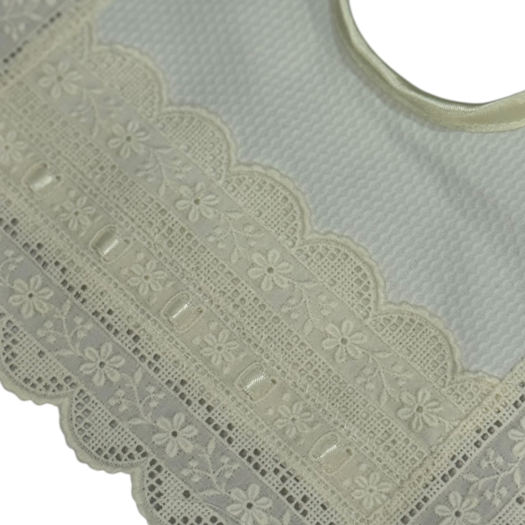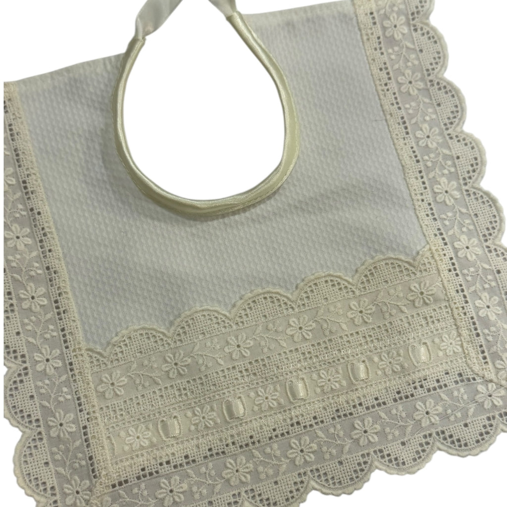 Stunning squared ivory bib with beautiful lace details. Elevate your babies outfit with this elegant bib.