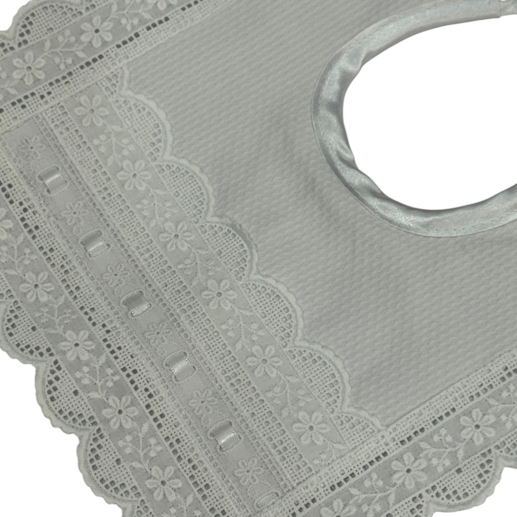 Beautiful white bib with beautiful lace details. Elevate your babies outfit with this elegant bib.