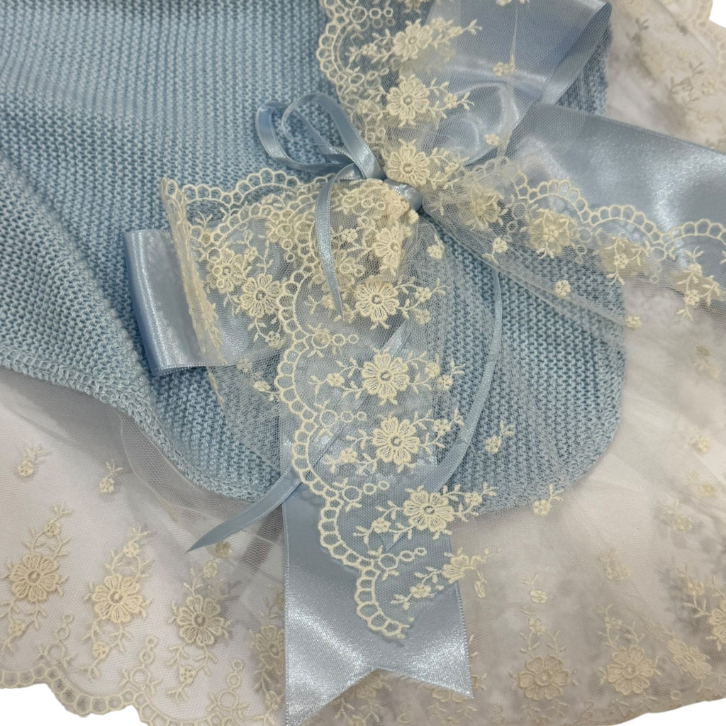 Beautiful light blue blanket with ivory lace in the borders, and a lace and blue bow in one of the corners.