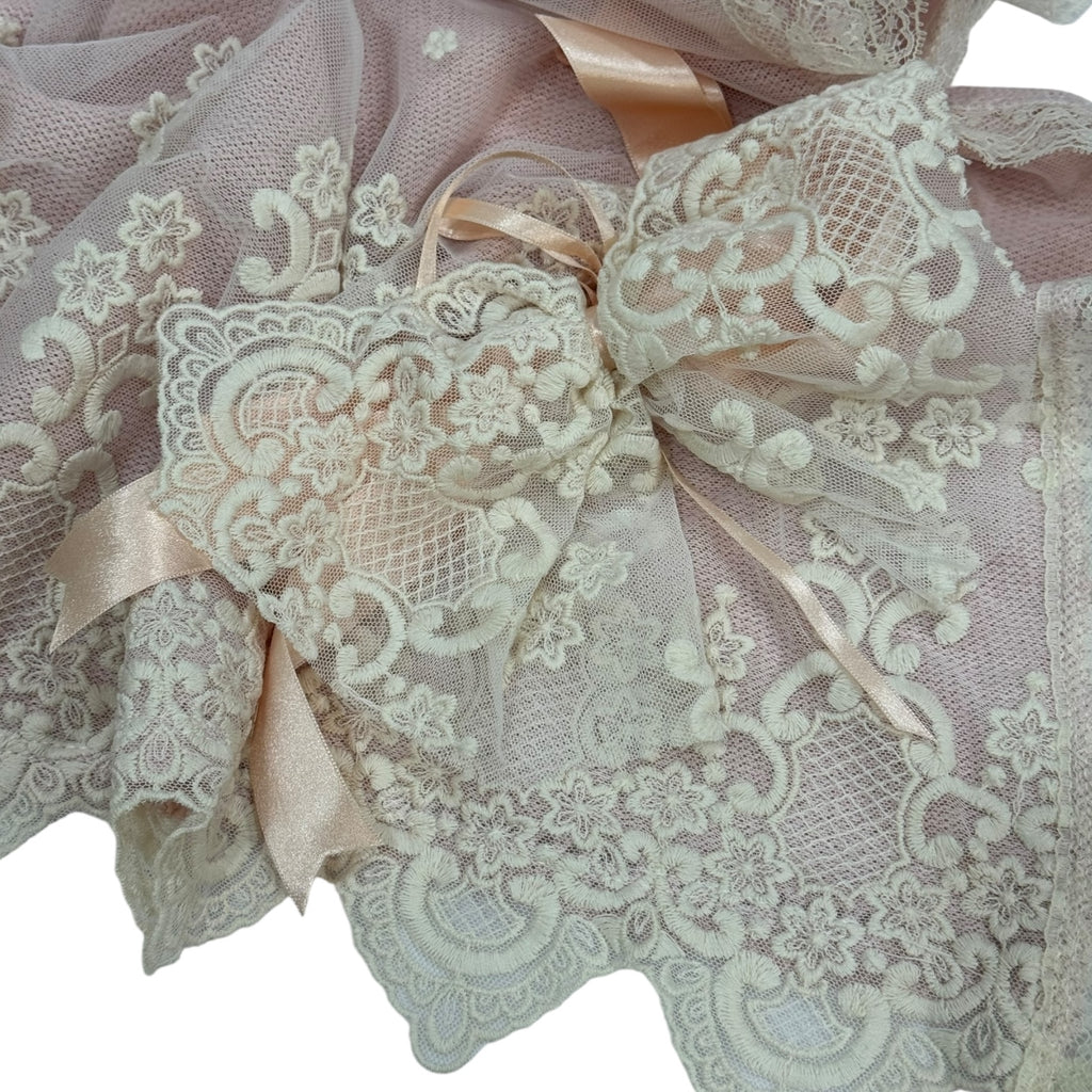 This dusty pink blanket is simply precious! It is adorned with a ivory lace around the borders, and has a statement lace bow in one corners for the perfect touch of charm. Combine with our Roman set for the complete look.