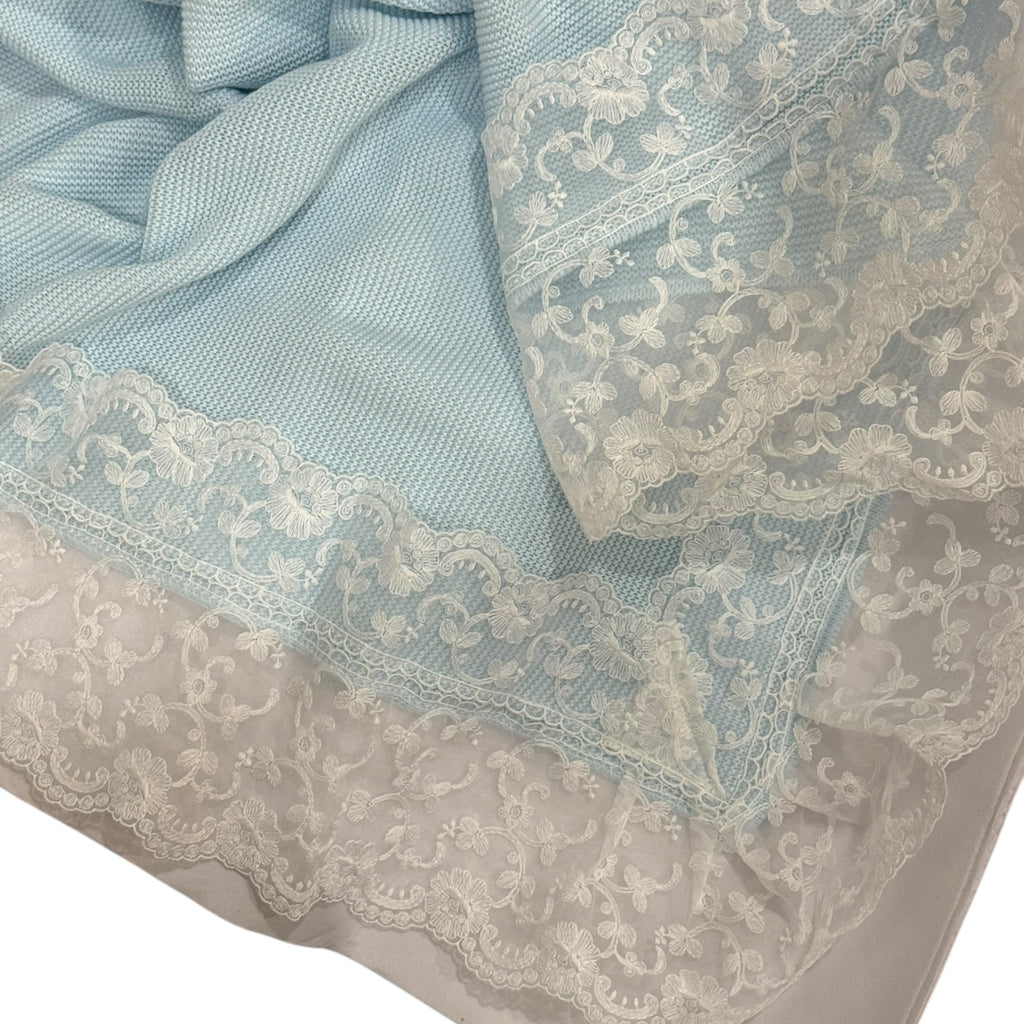 Stunning light blue blanket boasting a beautiful ivory lace and organza trim on the borders. Perfectly pairing with the Valeria knitted set, this luxurious ensemble makes a great gift for any special event, great for that first newborn photoshoot, or hospital picture.