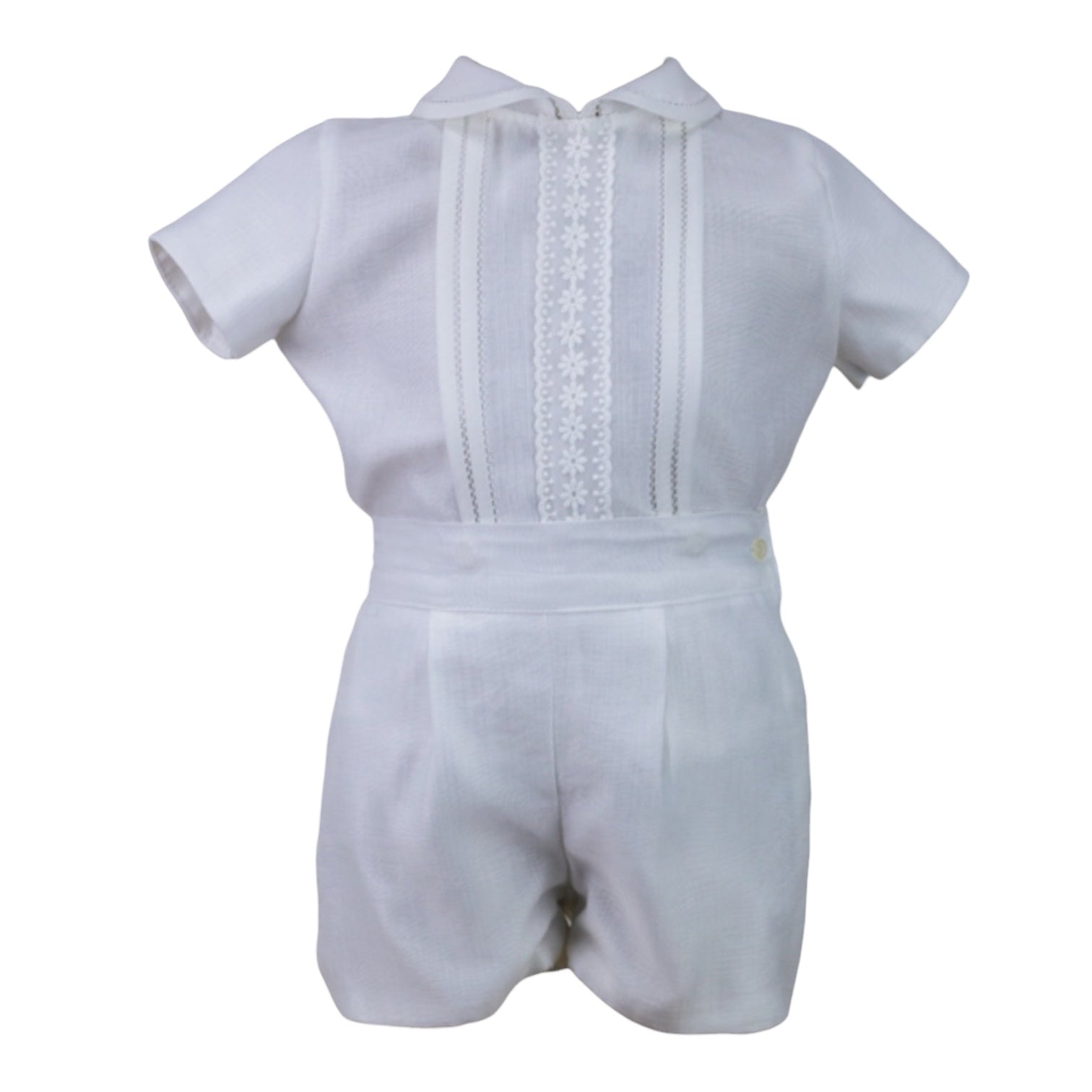 Beautiful regal two-piece set for boys, designed to create a princely appearance that will have heads turning! This set features a stunning off-white shirt pleated, and with a Peter Pan collar, paired with off-white shorts.