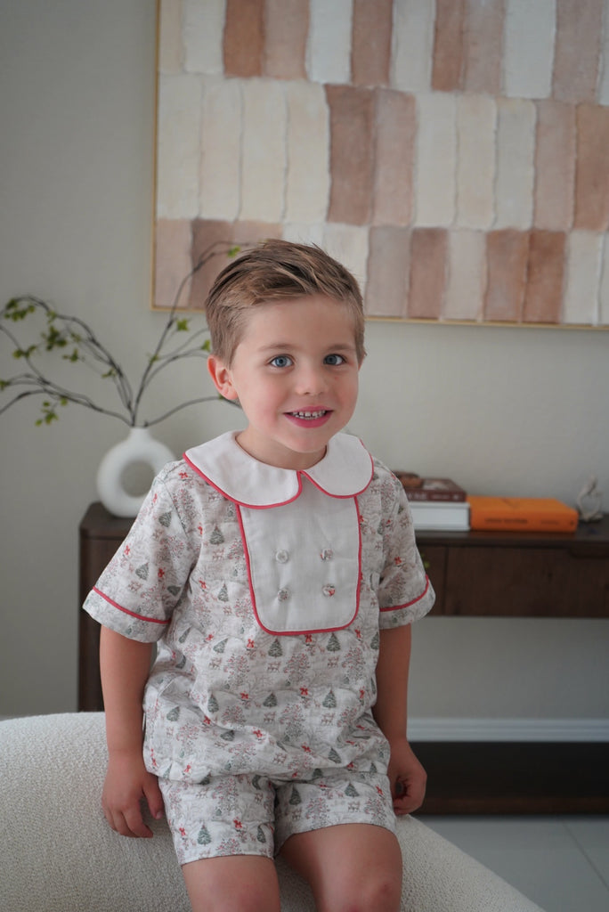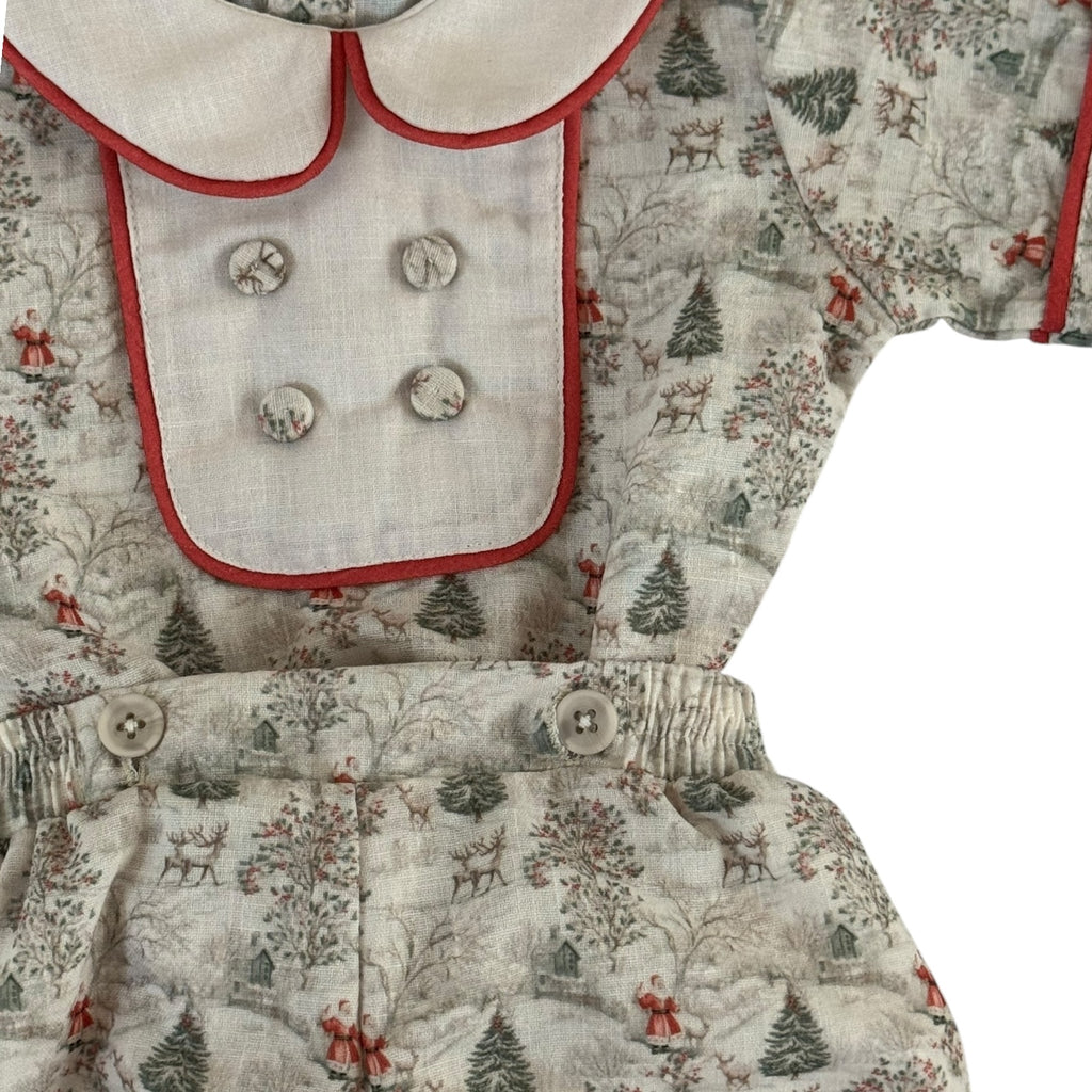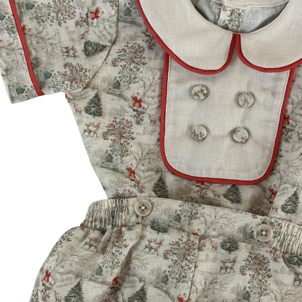 This precious 2-piece set for boys is made from a precious Santa Toile linen fabric. Shorts are elasticated and tied to the shirt up to size 36m/3T, sizes 4T and up are regular shorts and do not tie to shirt (see last pictures)