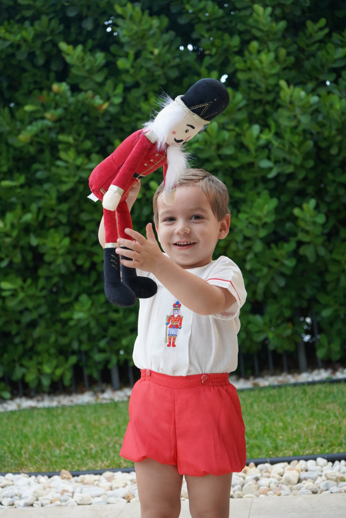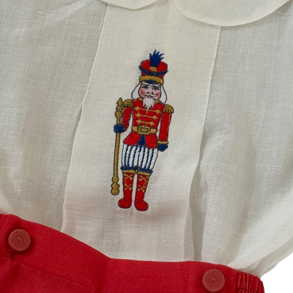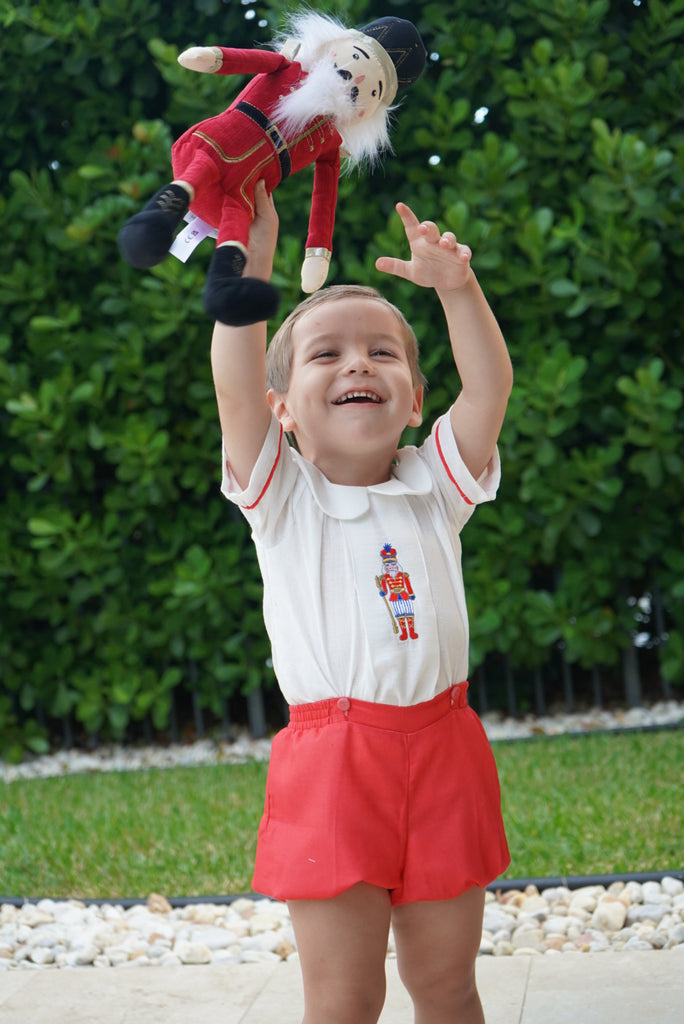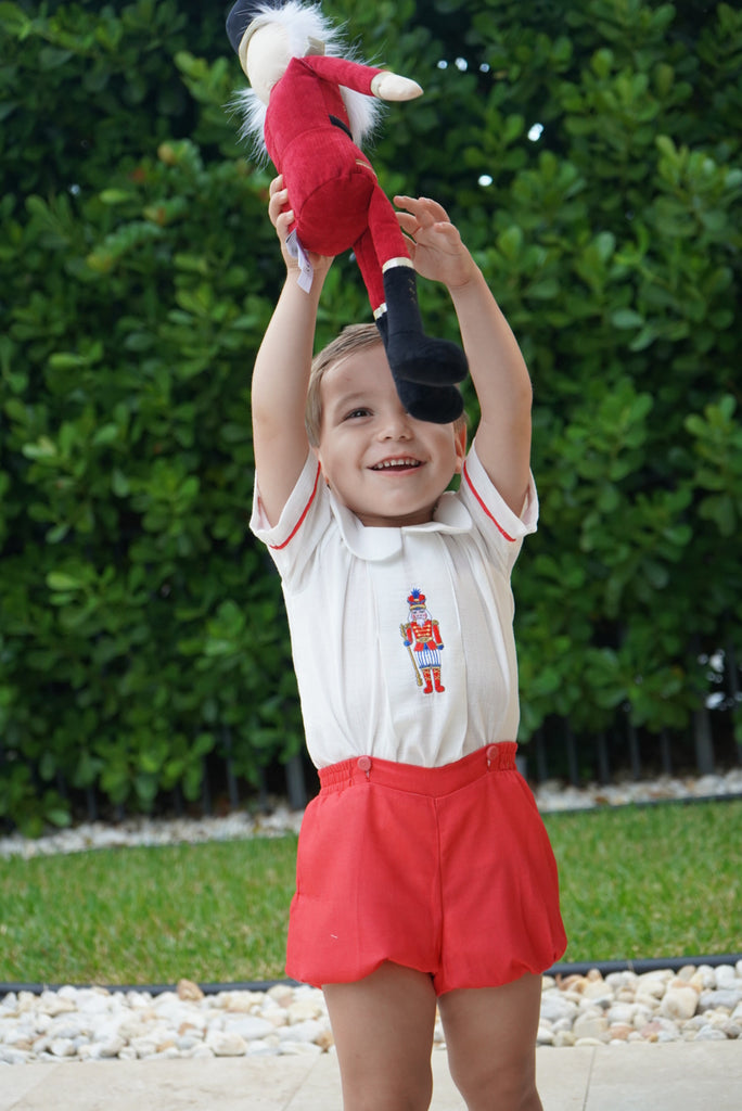 This precious 2-piece set for boys is a true heirloom piece. It has an embroidered nutcracker. Shorts are elasticated and tied to the shirt up to size 36m/3T, sizes 4T and up are regular shorts and do not tie to shirt.
