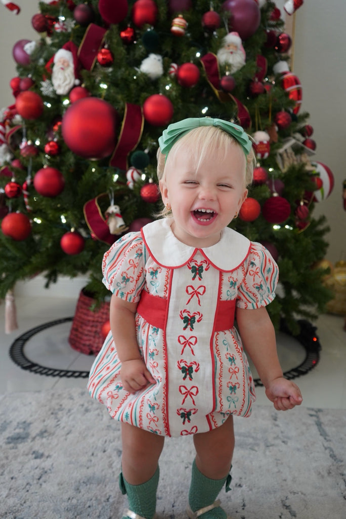 Stunning romper perfect for Xmas completely embroidered in the center featuring candy canes and bows.