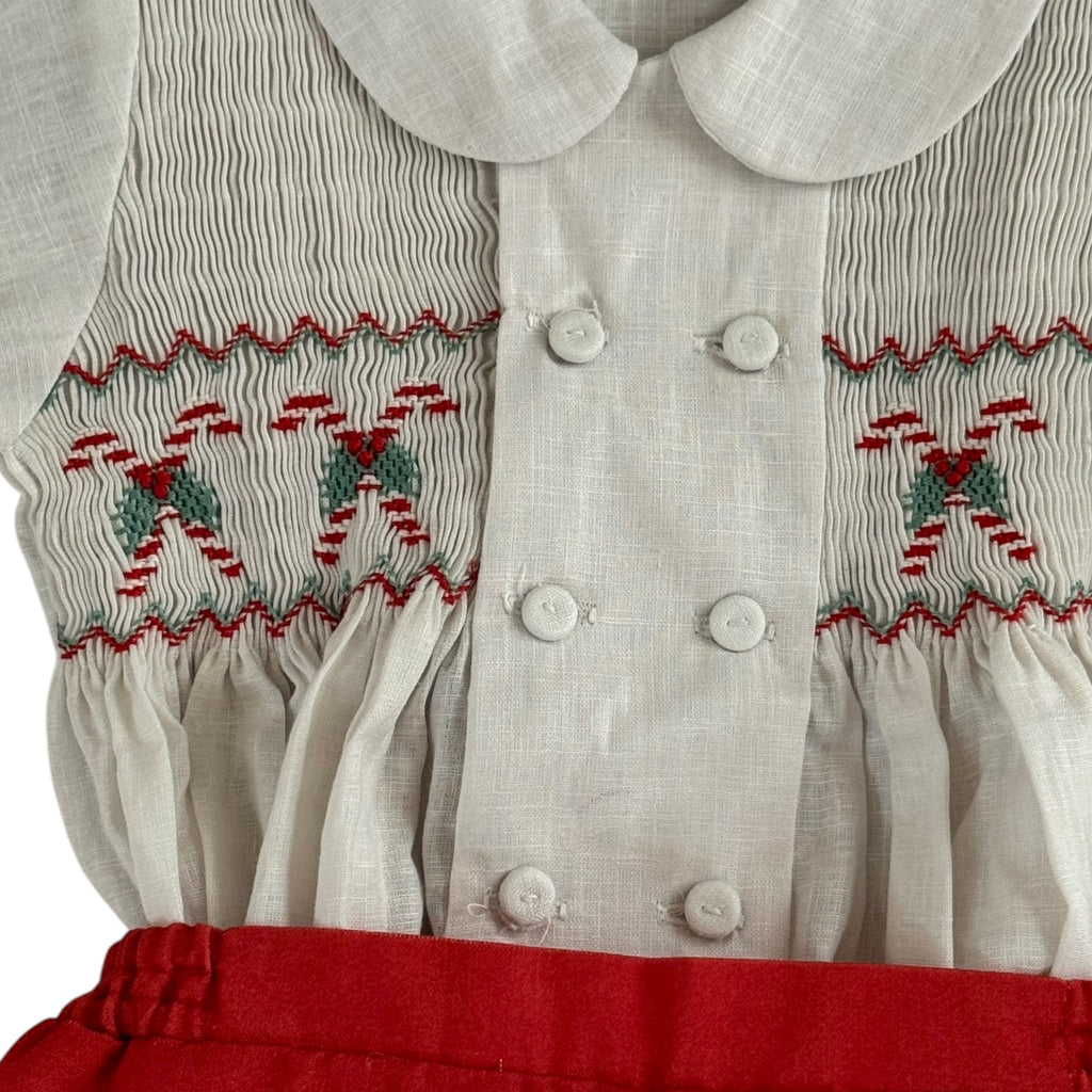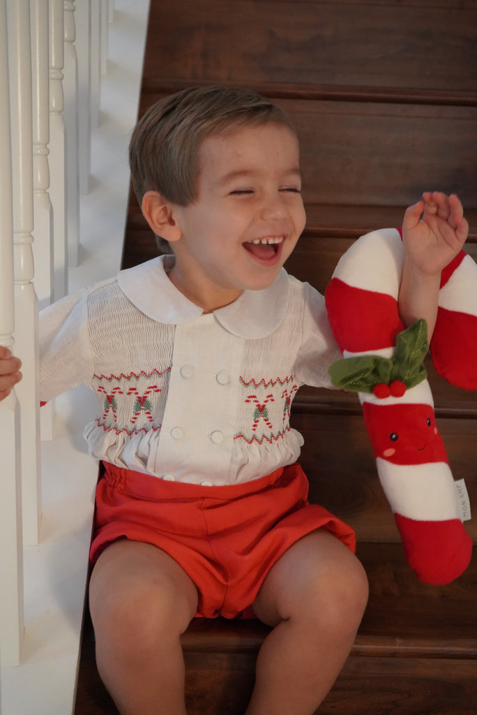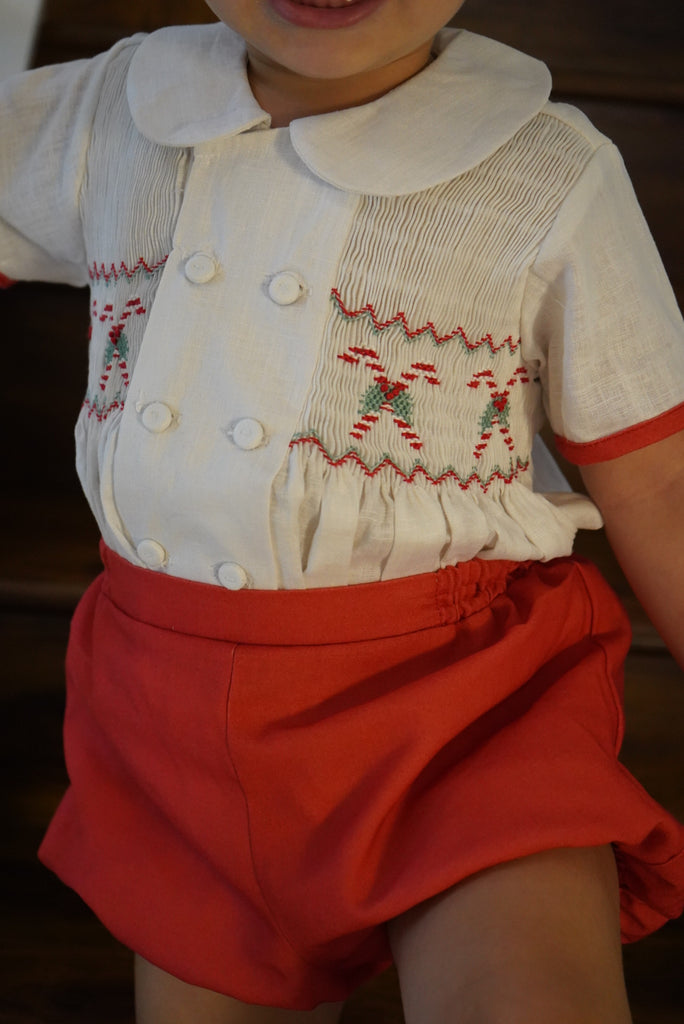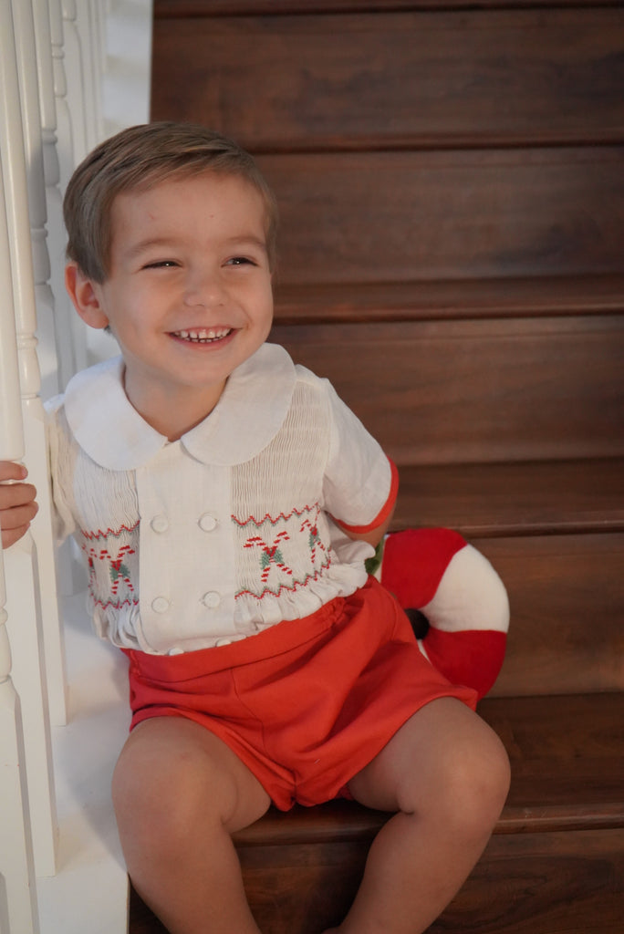This precious 2-piece set for boys is a true heirloom piece. It has handsmocked candy canes and comes with matching shorts. Shorts are elasticated up to size 36m/3T, sizes 4T and up are regular shorts.