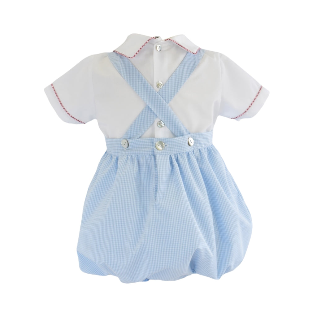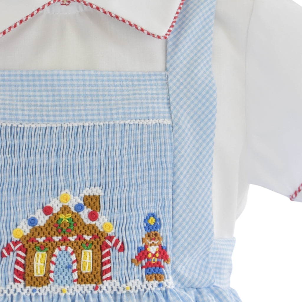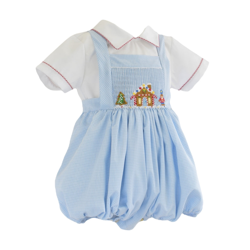 This precious Gingercracker 2-piece set romper for boys is a true heirloom piece. Lovingly crafted for the most magical time of the year. The romper features handsmocking of a Gingerbread Nutcracker, a Gingerbread house, among other precious details carefully stitched to perfection. Comes with a shirt with precious red trim.