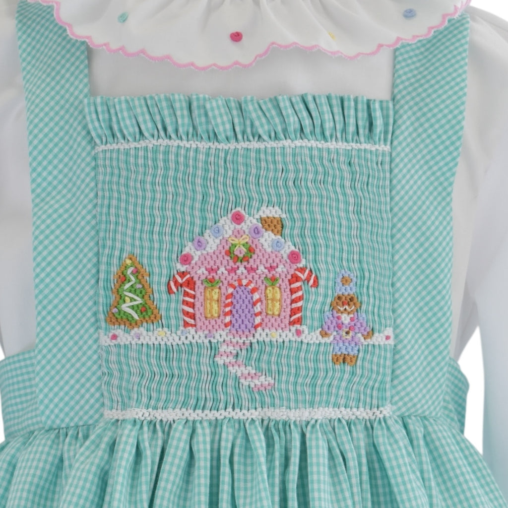 A Pastel Christmas Dream, for the mamas who adore soft and whimsical holiday tones, this Stunning Christmas Outfit is pure perfection. The charming jumper is beautifully handsmocked with enchanting motifs—a ginger nutcracker, a gingerbread house, and other precious details—all delicately crafted in dreamy pastel colors.