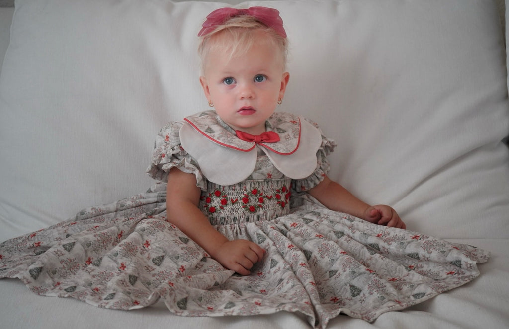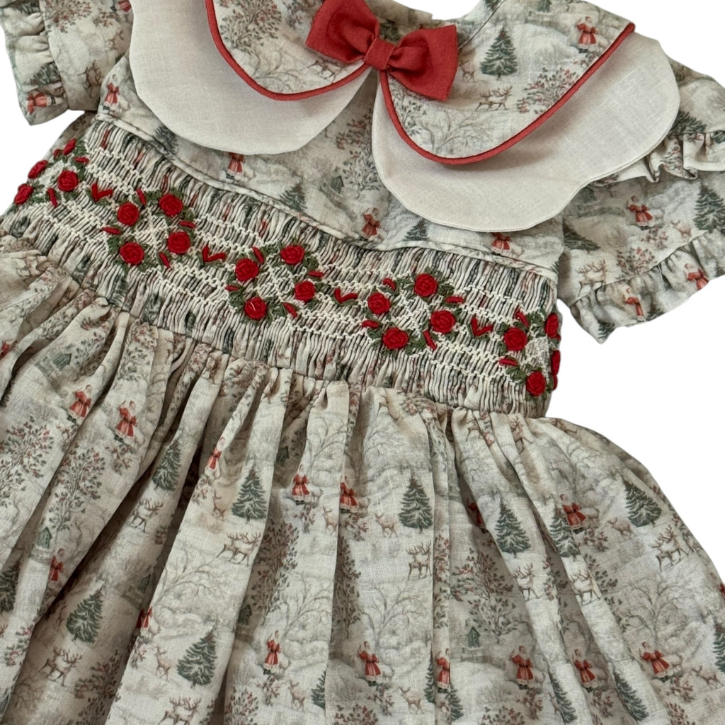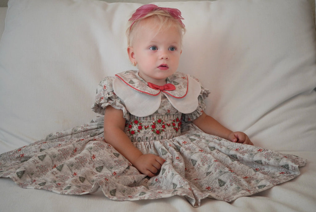 The most gorgeous dress from the entire Xmas capsule. This dress is crafted in a Toile de Jouy that features Santa. It has handsmocked details resembling a Xmas Wreath, and a double collar with a bow. Absolutely stunning piece!