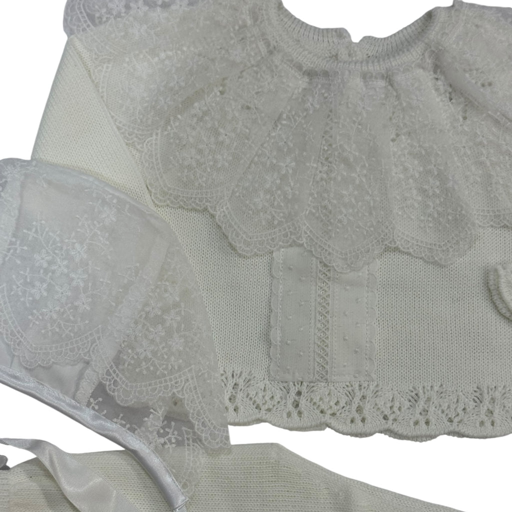 Exquisite 3-piece set in off-white, with gorgeous lace details in pure white. Match with our Gloria knitted blanket and Bassinet Pad