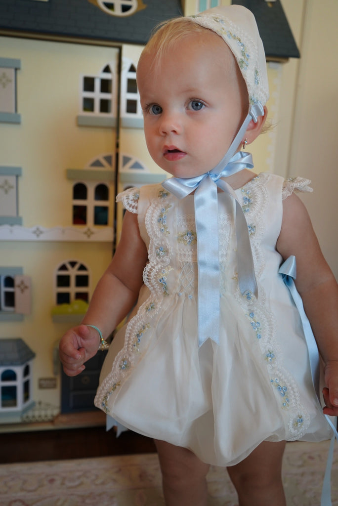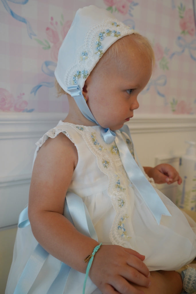Absolutely stunning romper, which comes with booties or socks, and a matching bonnet, with beautiful and delicate roses lace embroidered in blue color.