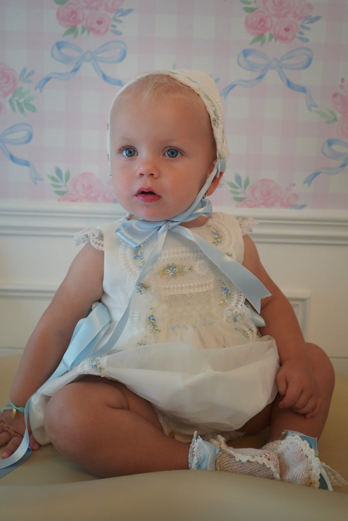 Aida Handsmocked Blue Rose Romper 3-piece set