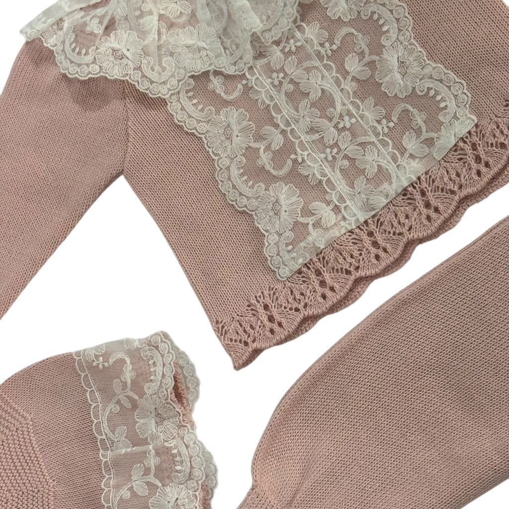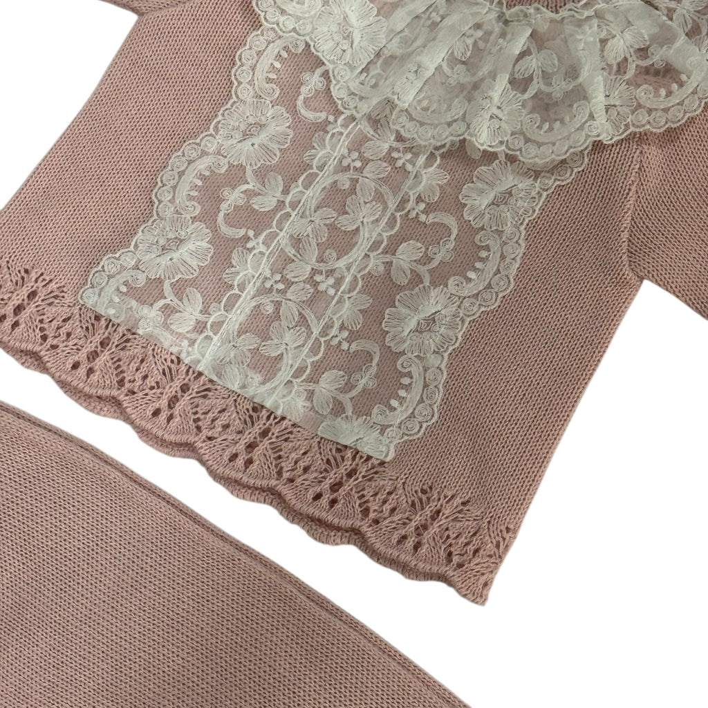 Incredibly stunning 3-piece set in dusty pink, with gorgeous white lace. Set consists on top, pants, and a bonnet. This sophisticated set is composed of timelessly stylish elements, offering a luxurious blend of quality and artistry.