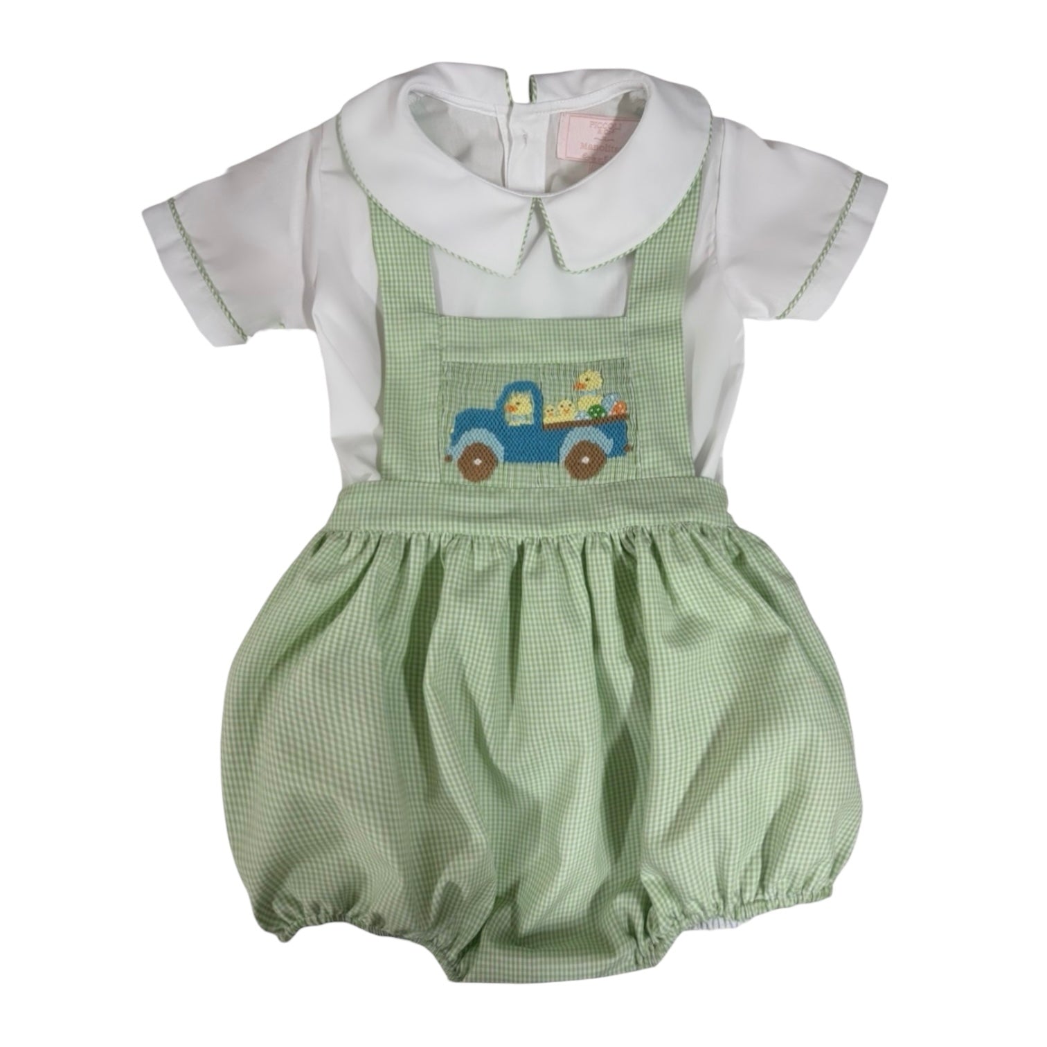 For sizes up to 36 months, this two-piece set features an elasticated bubble-style bottom for the romper, in classic green gingham, paired with a handsmocked top showcasing the sweetest ducks and trucks motif—playful yet timeless.
