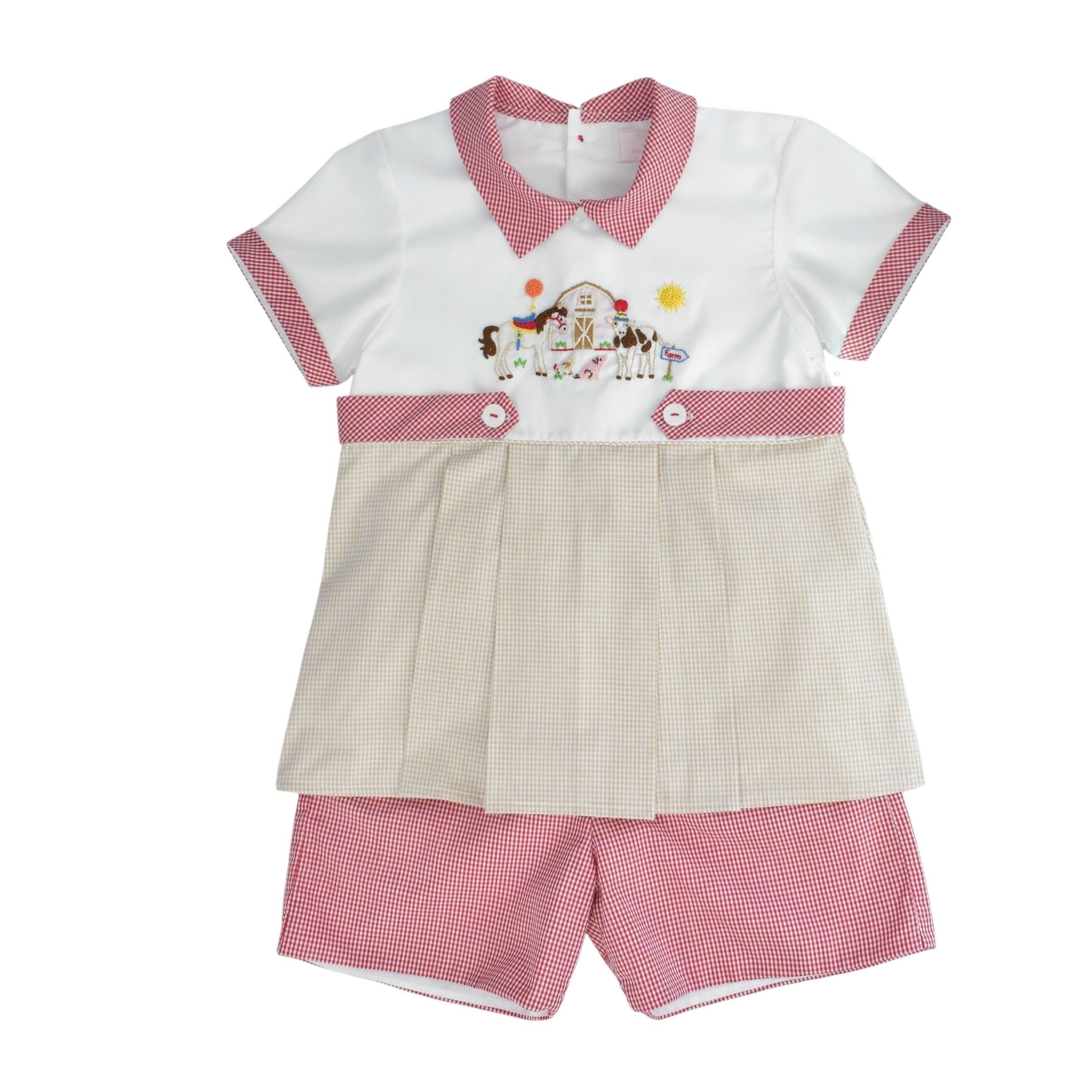 This adorable Farm Animals French Knot two piece set is a handmade romper for boys, featuring a farm animals handmade with intricate french knots. Made with high-quality beige and red gingham and white cotton fabric.