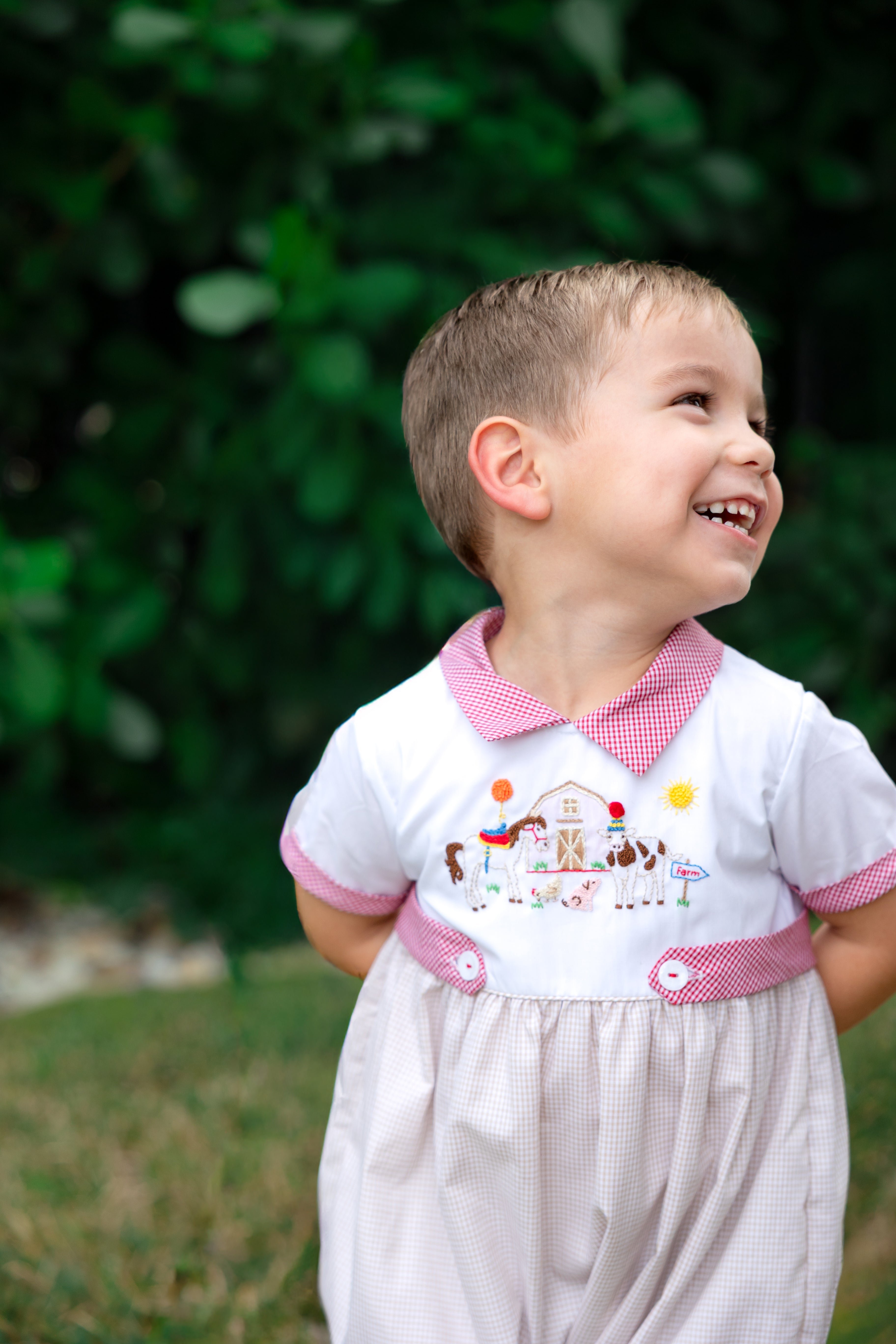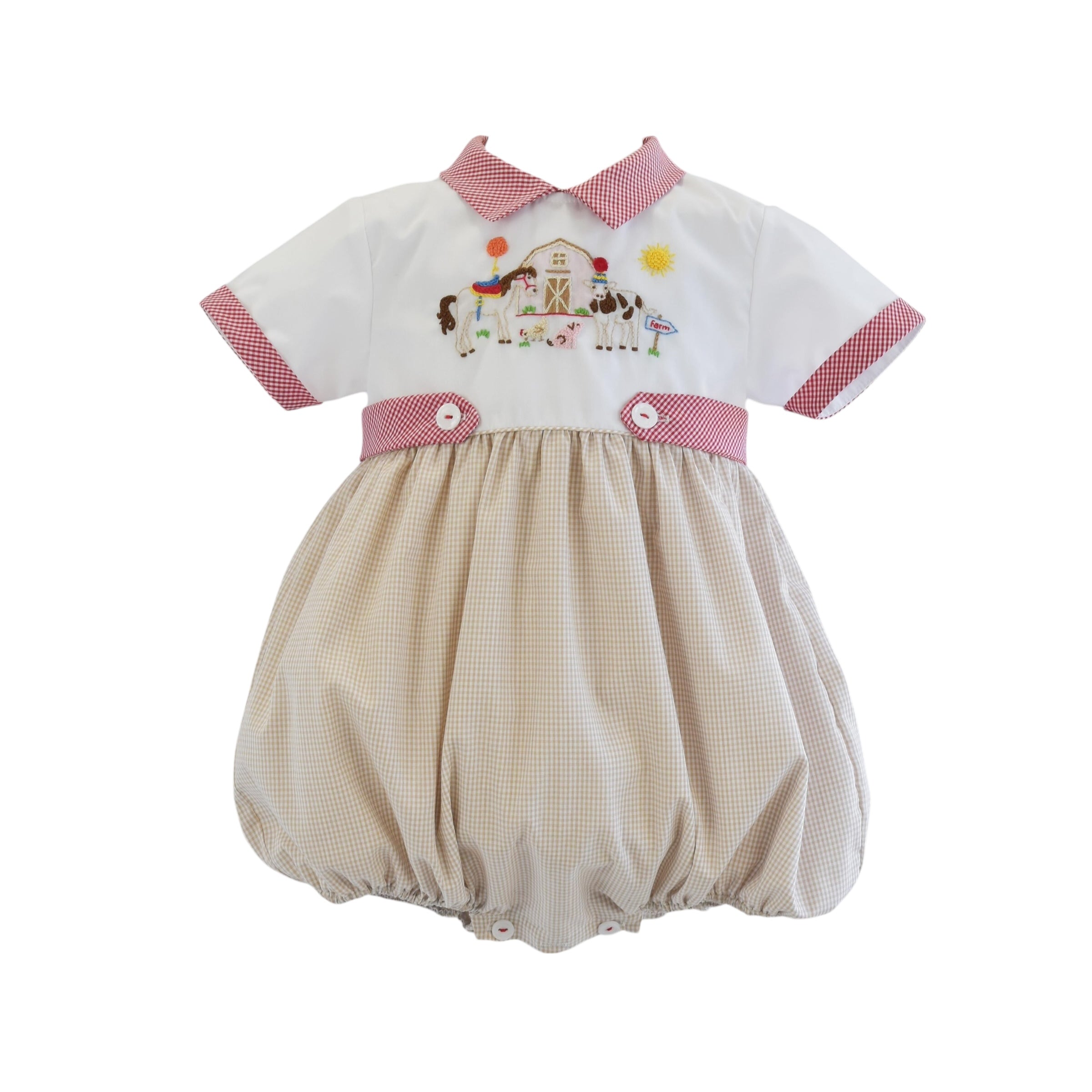 This adorable Farm Animals French Knot Bubble is a handmade romper for boys, featuring a party farm animals handmade with intricate french knots. Made with high-quality beige and red gingham and white cotton fabric.
