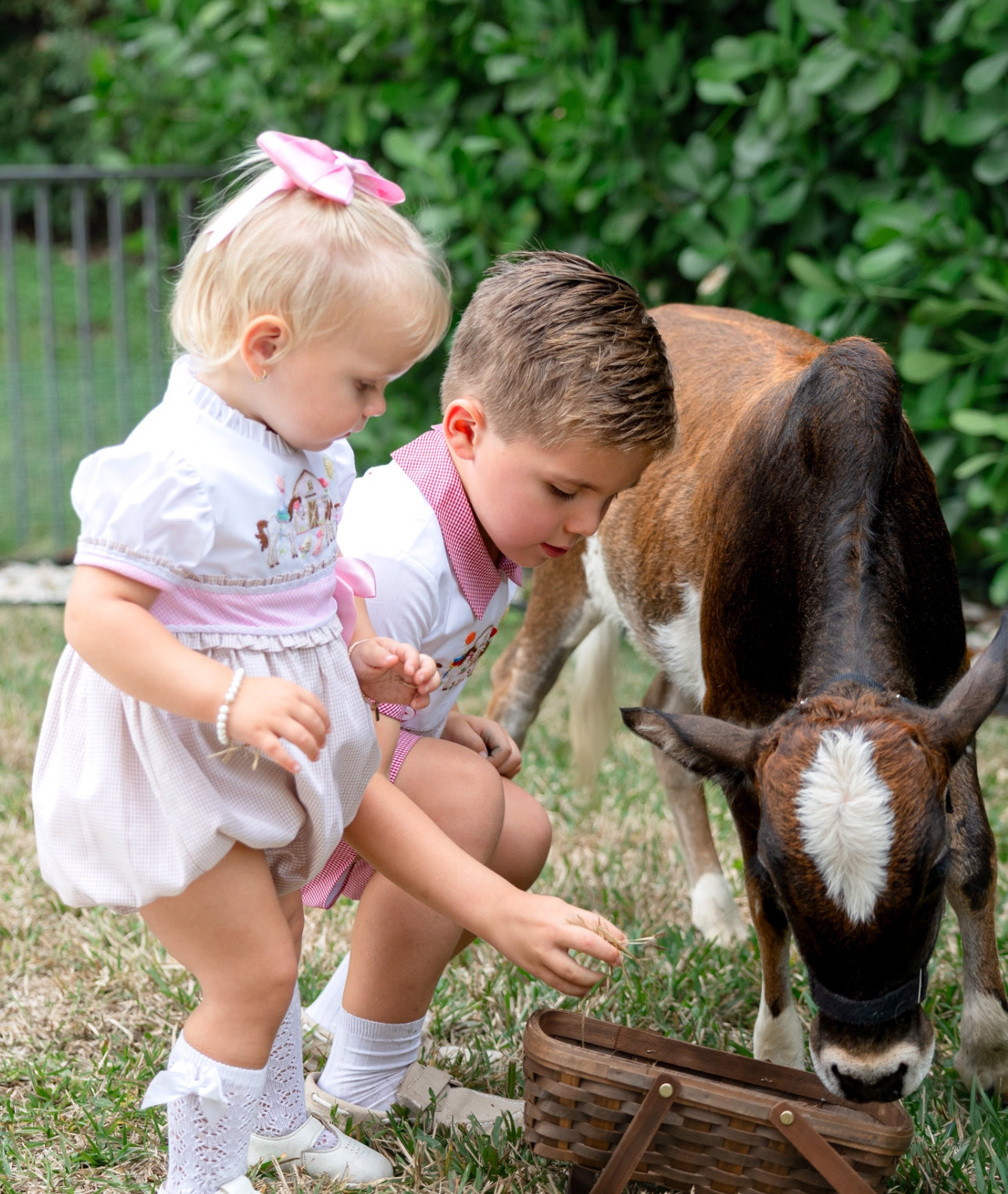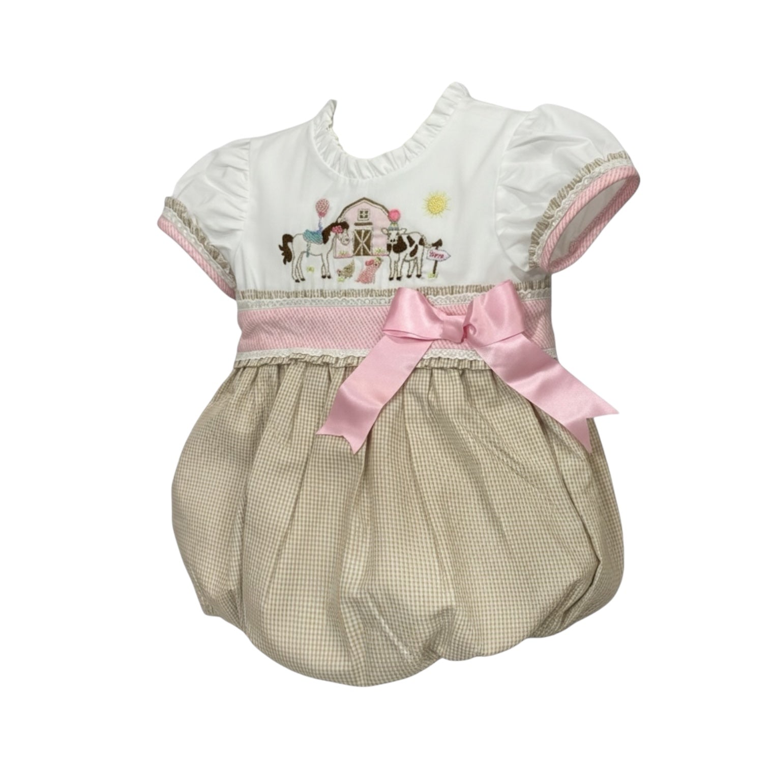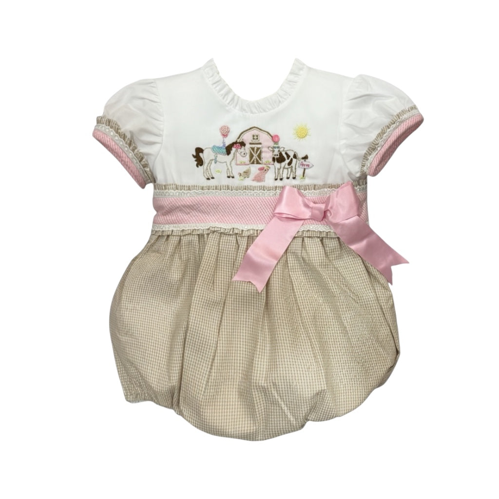 This adorable Farm Animals French Knot Bubble is a handmade romper for girls, featuring party farm animals handmade with intricate french knots. Made with high-quality beige and pink gingham, and white cotton fabric.