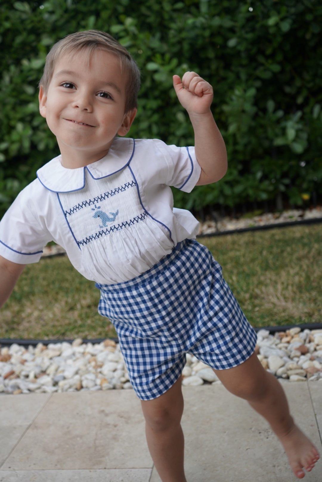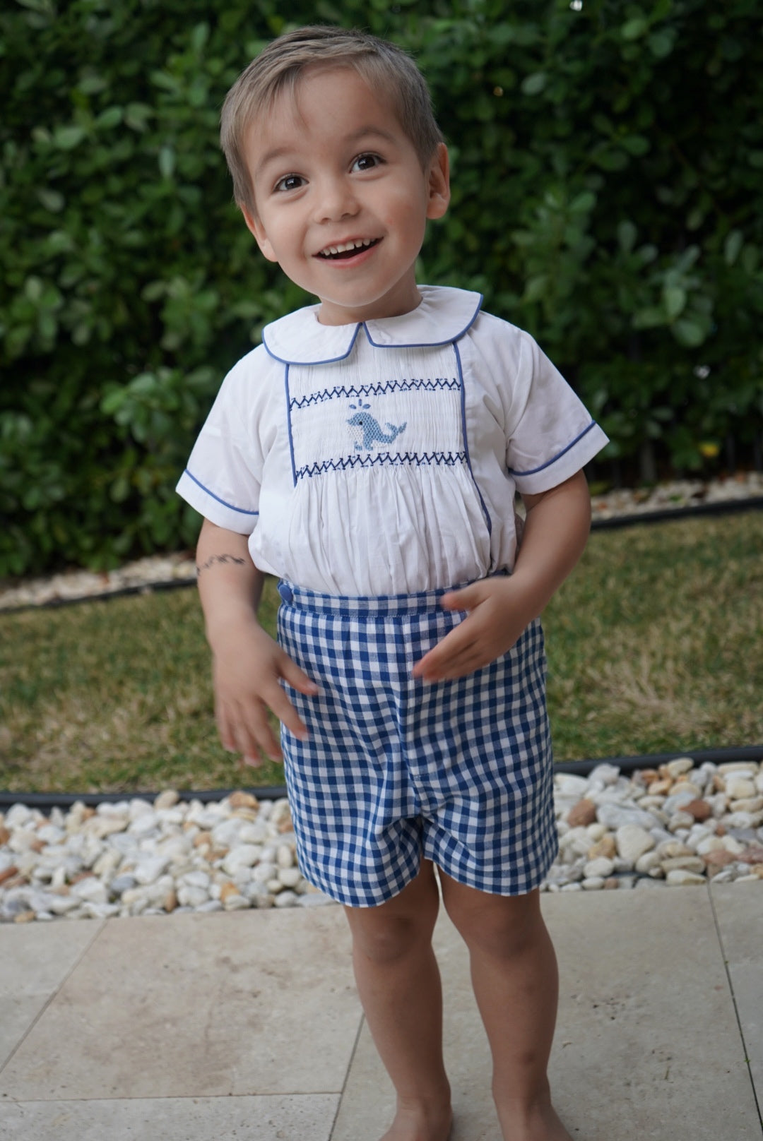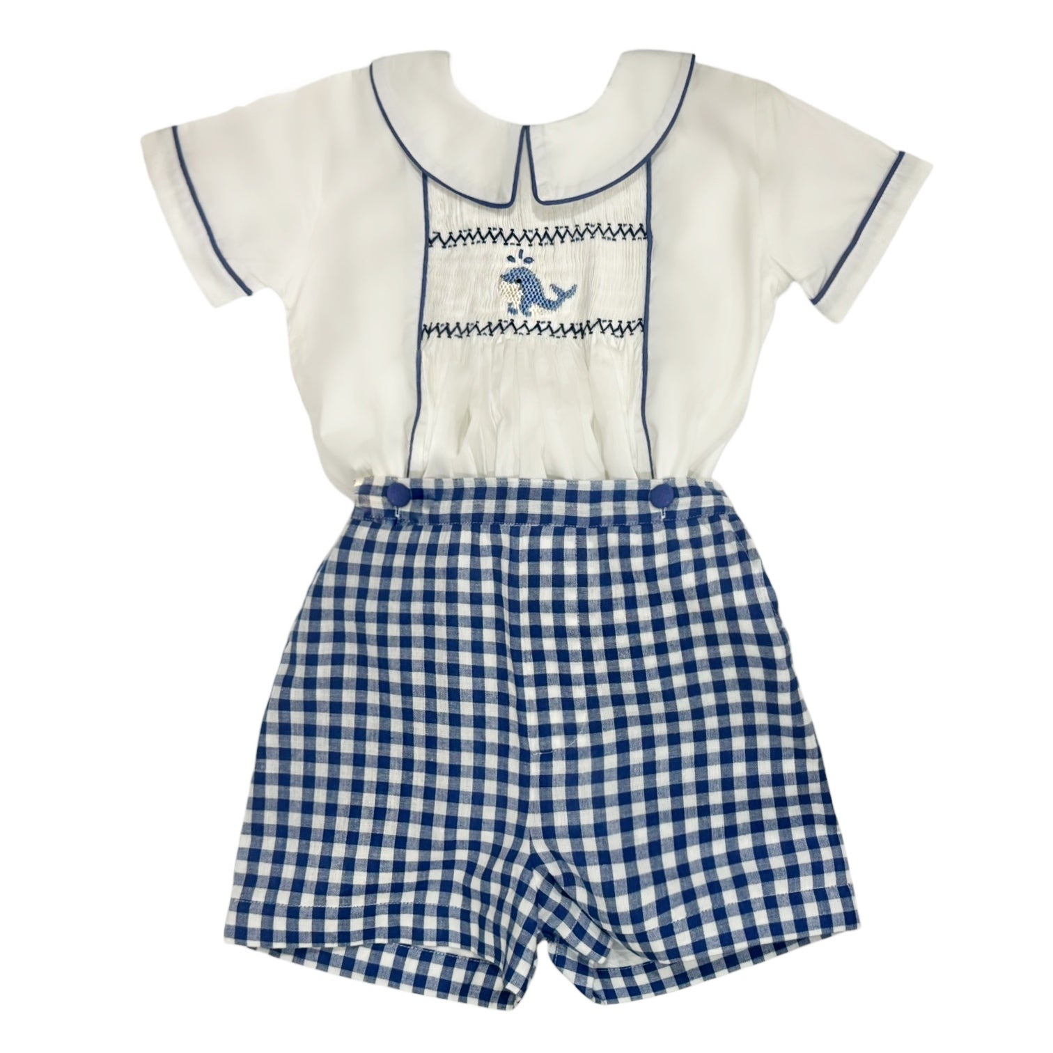 This adorable set for boys is crafted in 100% cotton with a whale handsmocked in the center. Shorts tie to shirt.