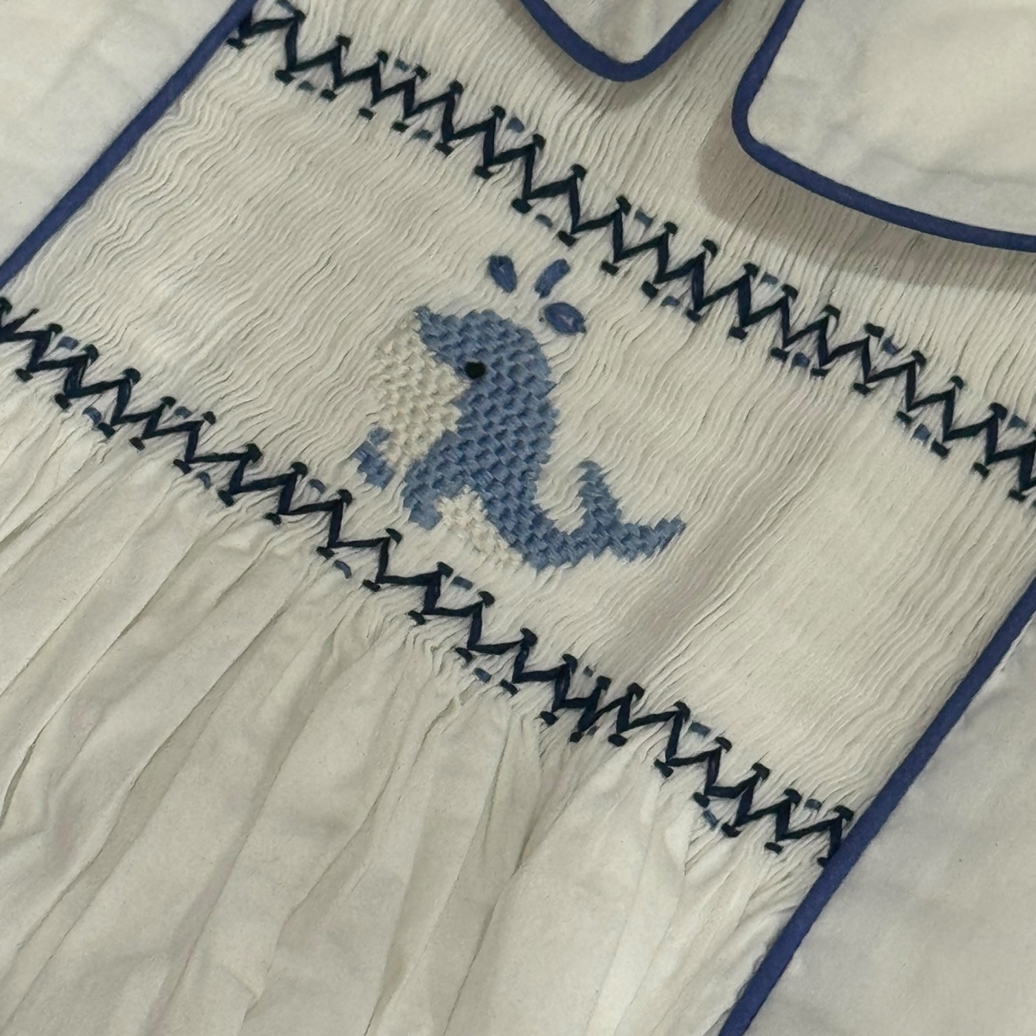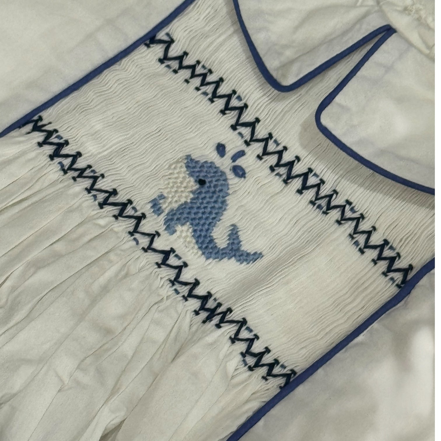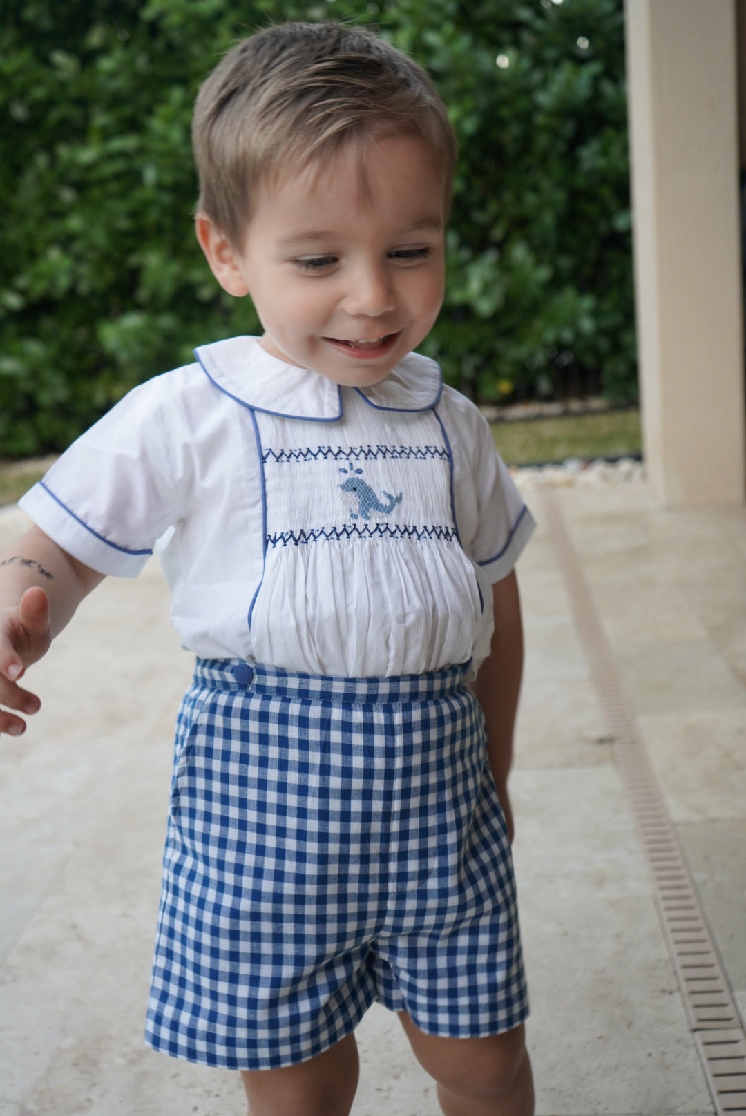 This adorable set for boys is crafted in 100% cotton with a whale handsmocked in the center. Shorts tie to shirt.