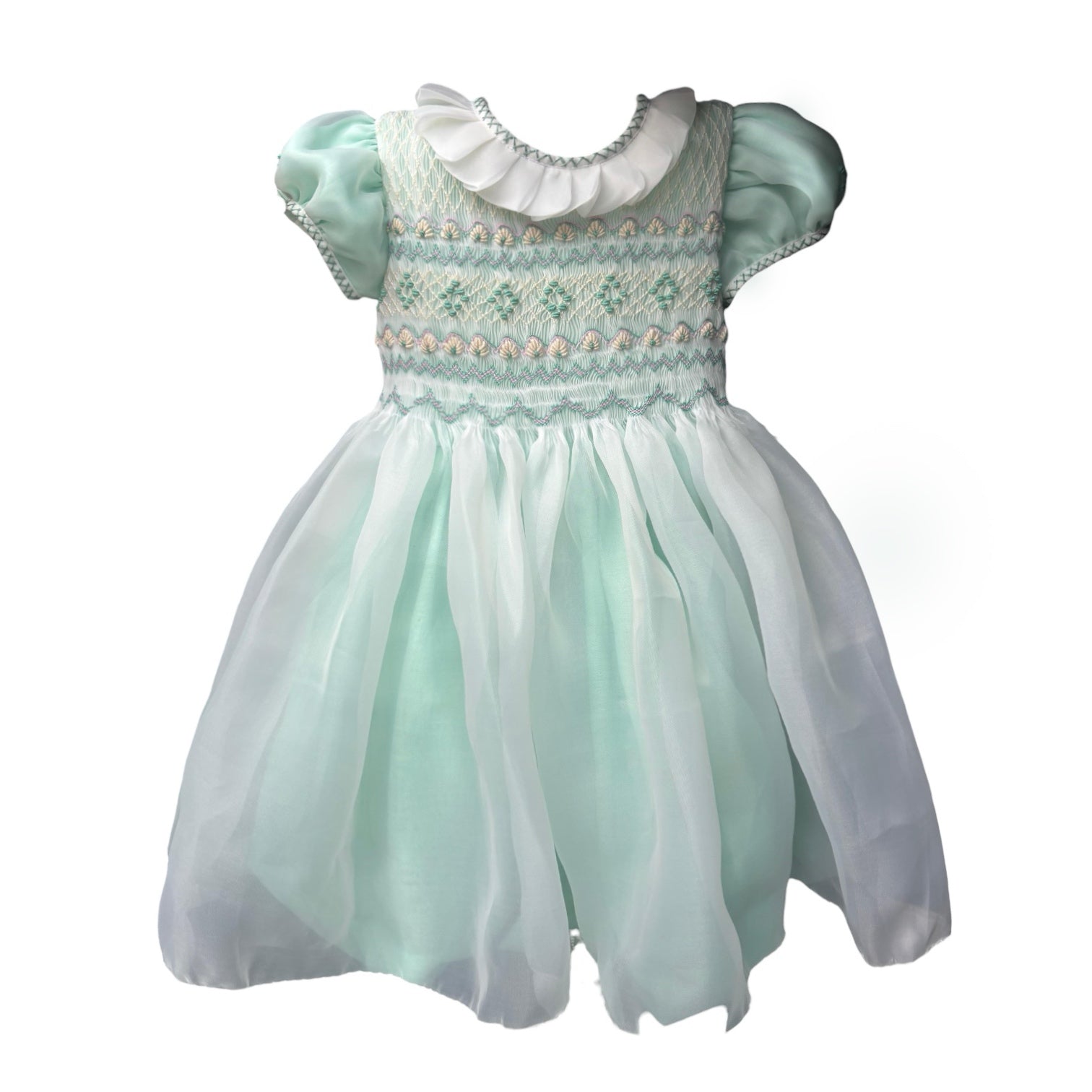 Inspired by the beauty of the sea, this handsmocked organza dress is thoughtfully made to feel both ethereal and timeless for all Mermaid parties. An aqua cotton lining lies beneath layers of light organza, while intricate handsmocking adorns the bodice, creating a look worthy of a little sea princess.
