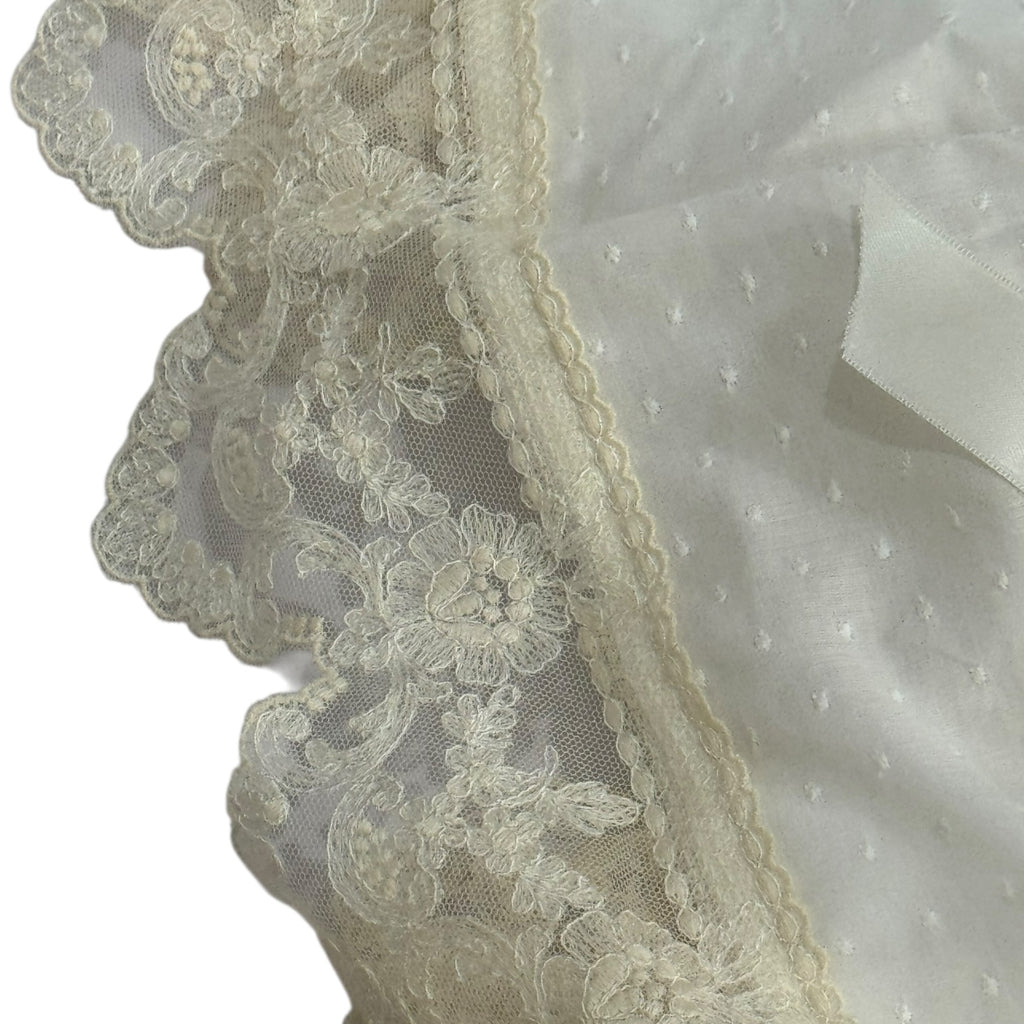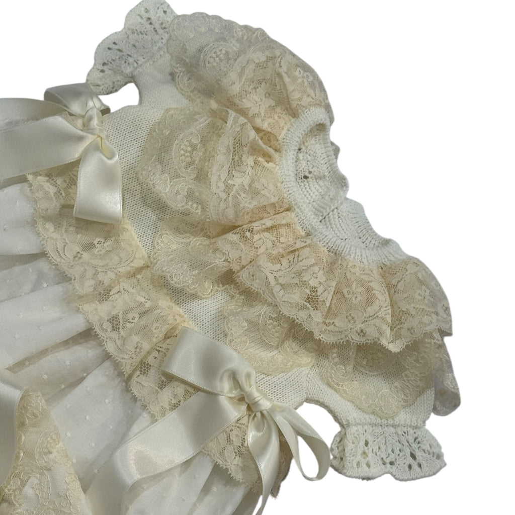 Beautiful half-knitted short-sleeve gown in ivory color. Knitted on the top with gorgeous lace. The lower part is made of a cotton swiss dot fabric. The gown comes with bloomers anda bonnet