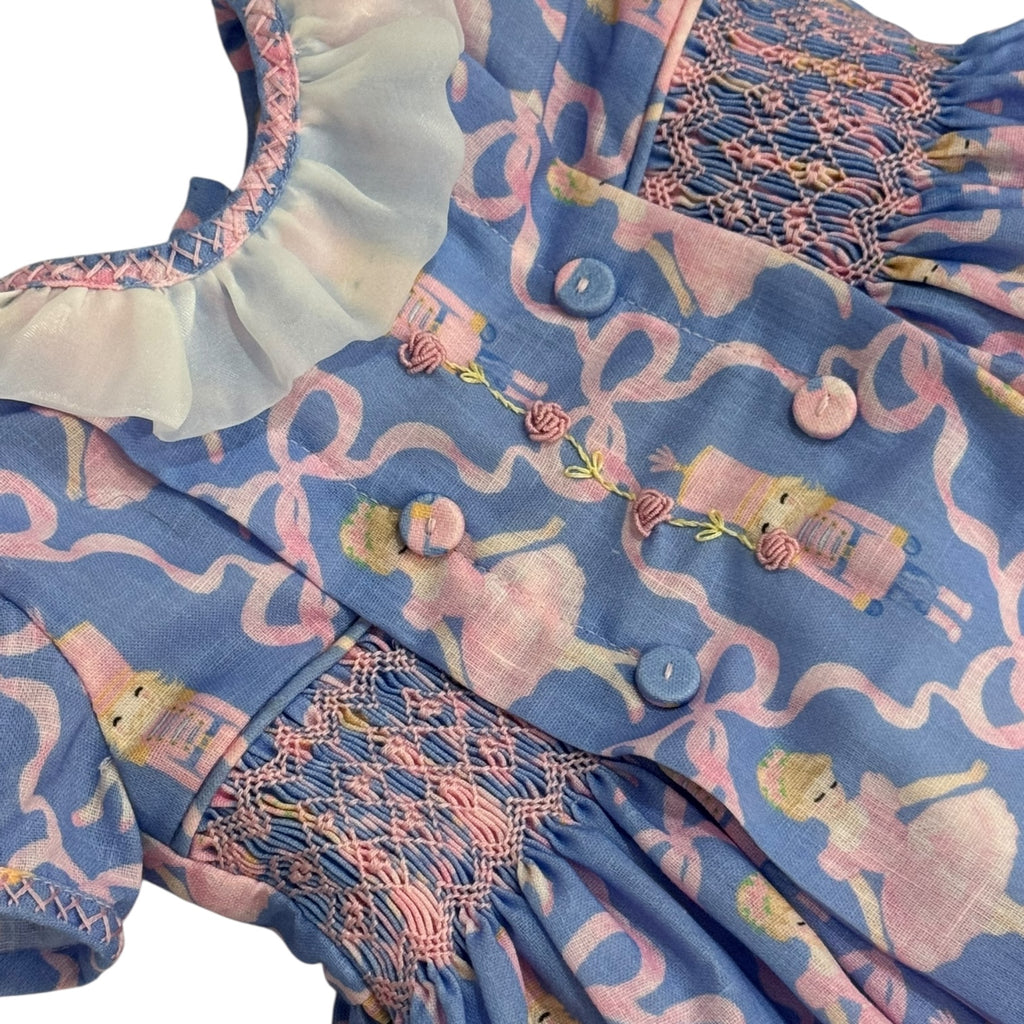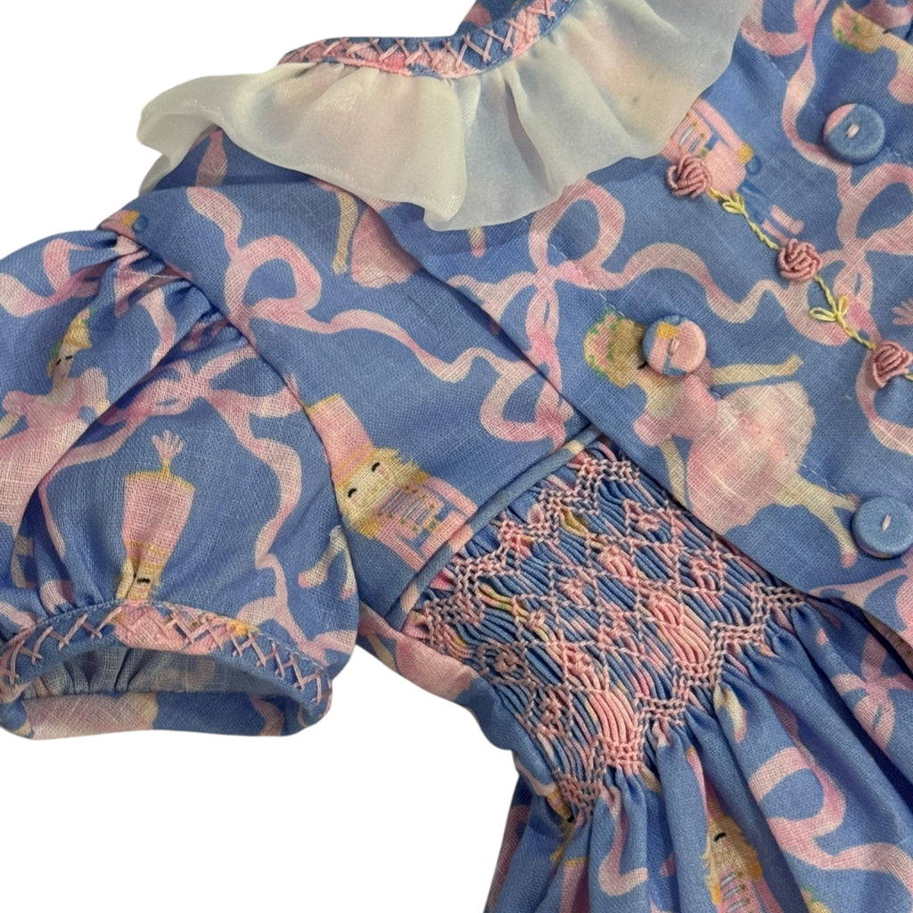 Indulge in our Exclusive handembroidered and handsmocked dress. Made from luxurious linen fabric, featuring enchanting ballerinas and nutcrackers, this romper is truly exquisite.