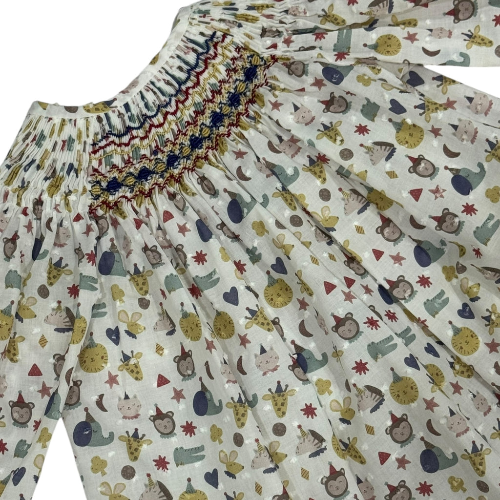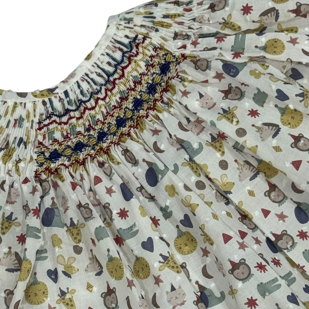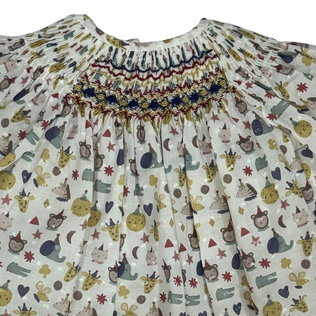 Birthday dress in a super cute fabric featuring party animals with birthday hats. The dress has handsmocked flowers on the top.
