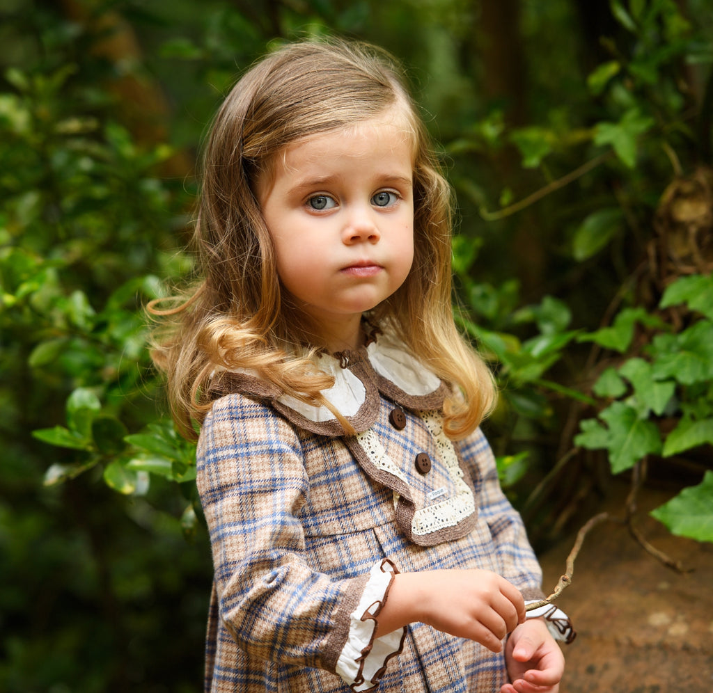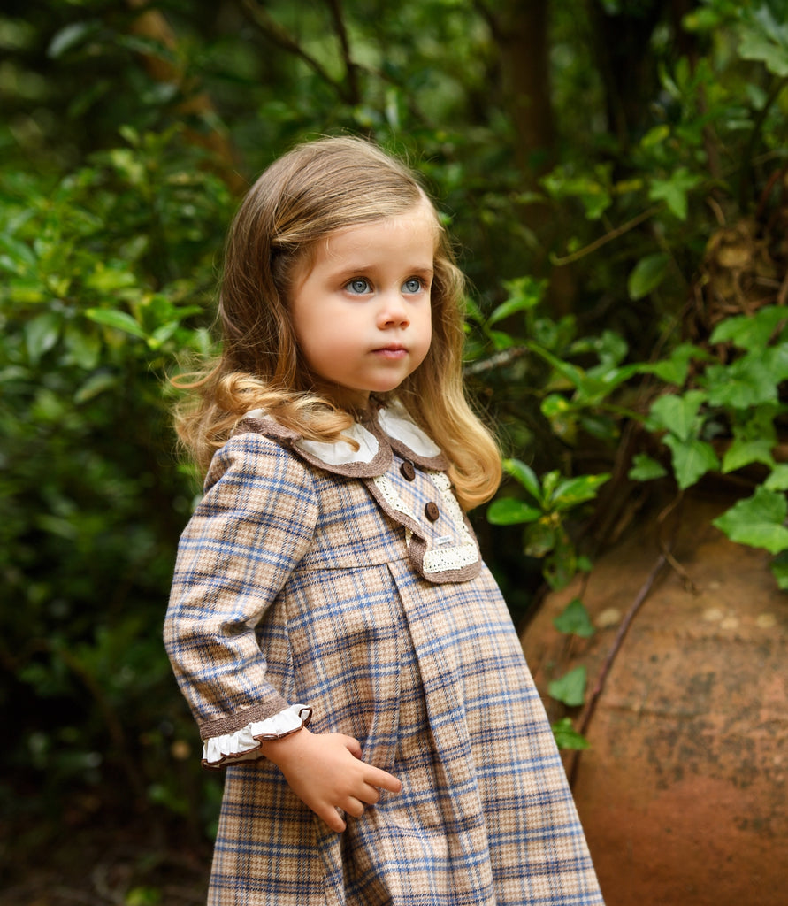Adorable checkered dress in beige/blue to match our Blue Bears siblings capsule