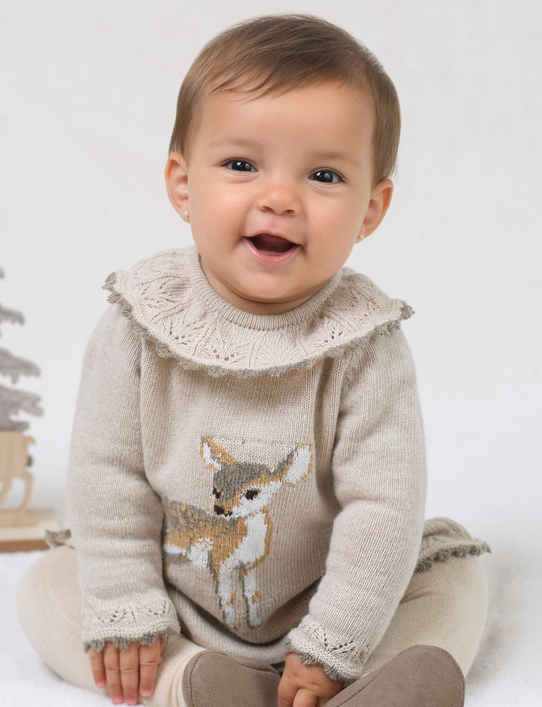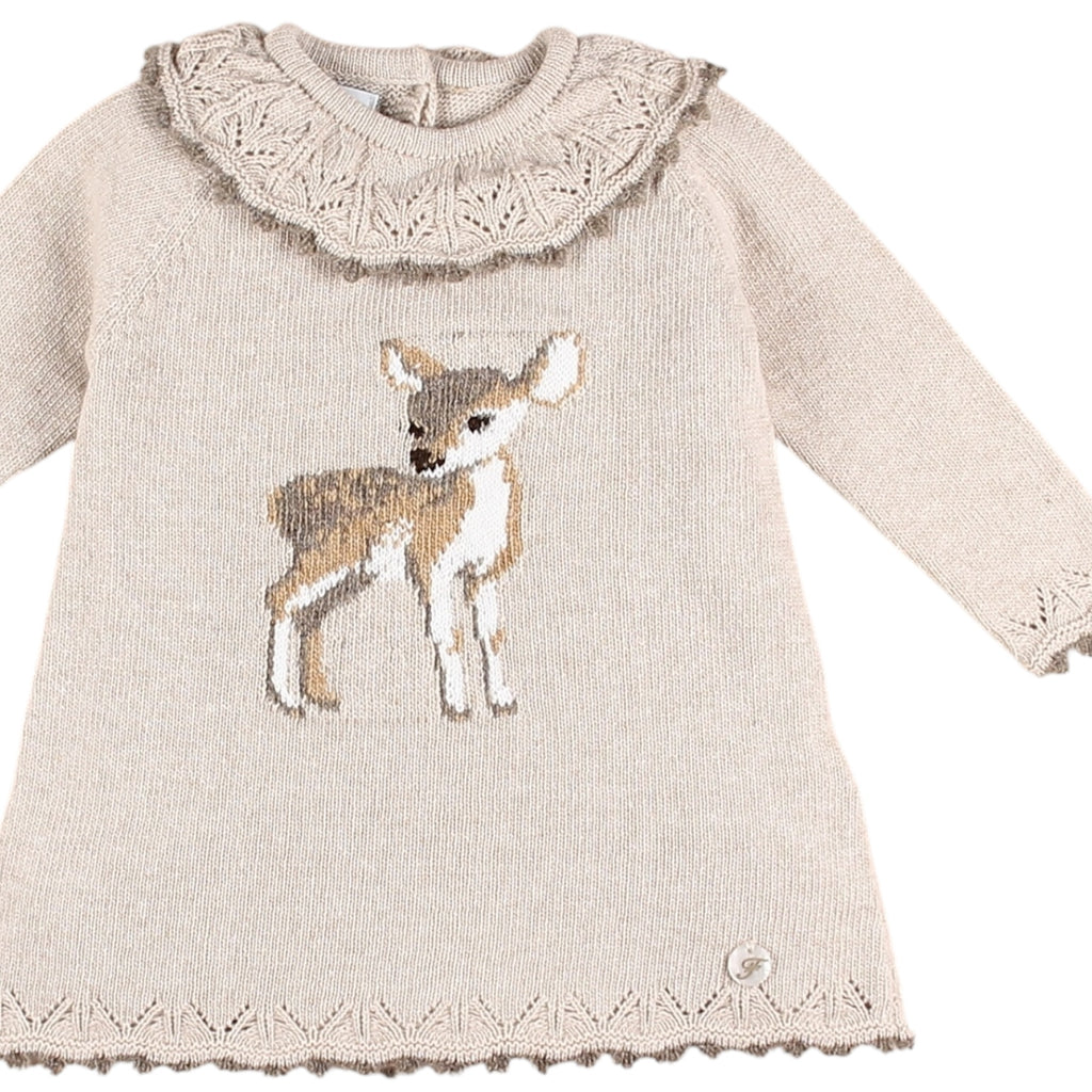 Beautiful knitted dress for girls with a little deer on the center. Comes with matching bonnet.