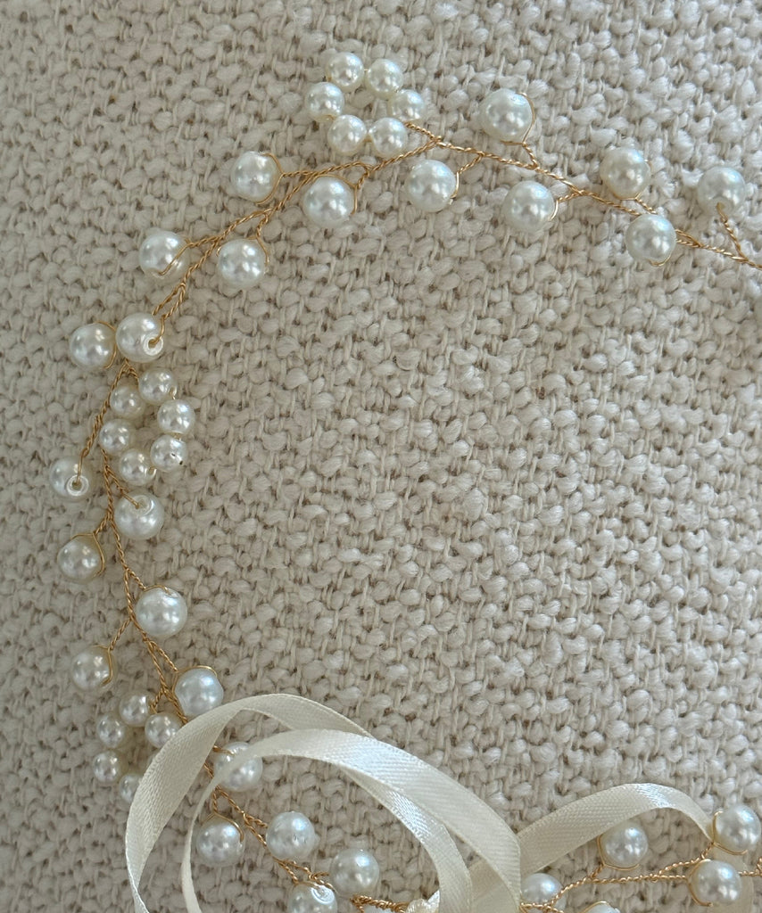 Our wonderful exclusive range of wreaths and headbands. This beautiful wreath is made with ivory pearls, and rex murano beads at the ends of a golden twisted wire. Ties with a ivory satin ribbon.