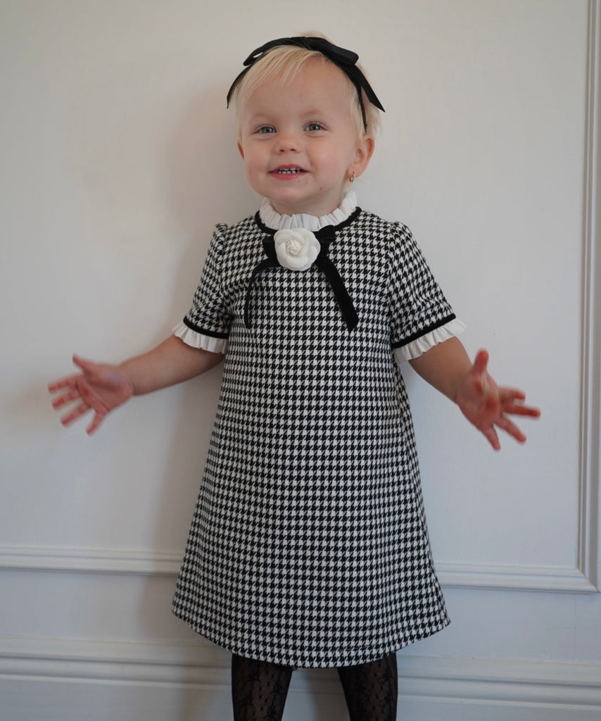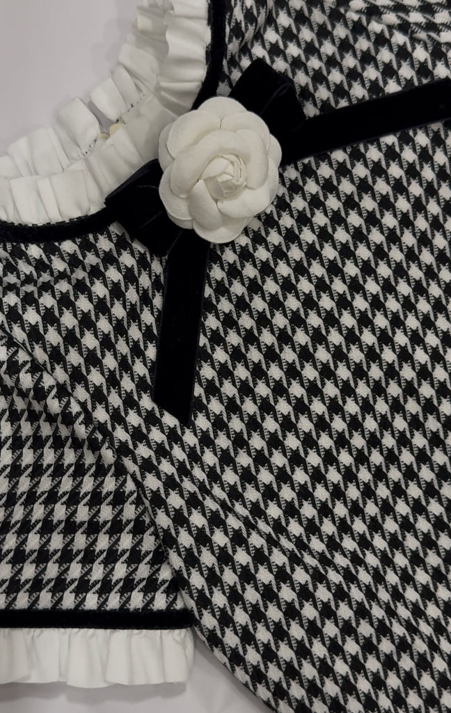 Stunning dress made of a houndstooth fabric, with white collar and sleeves trims, wnd a beautiful rose in the center.