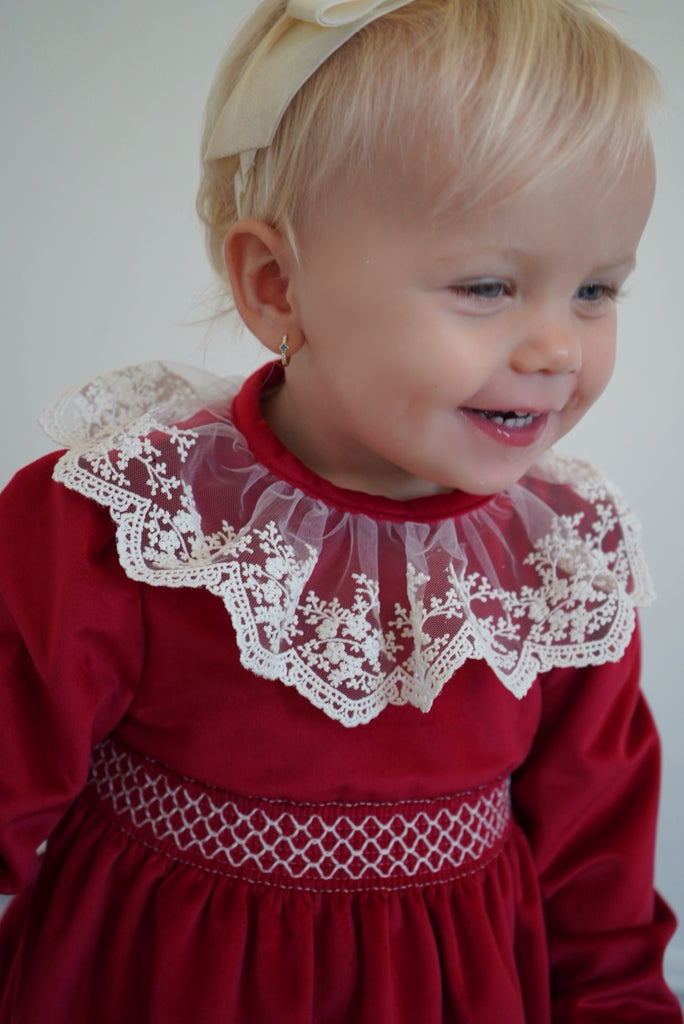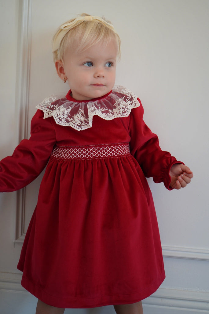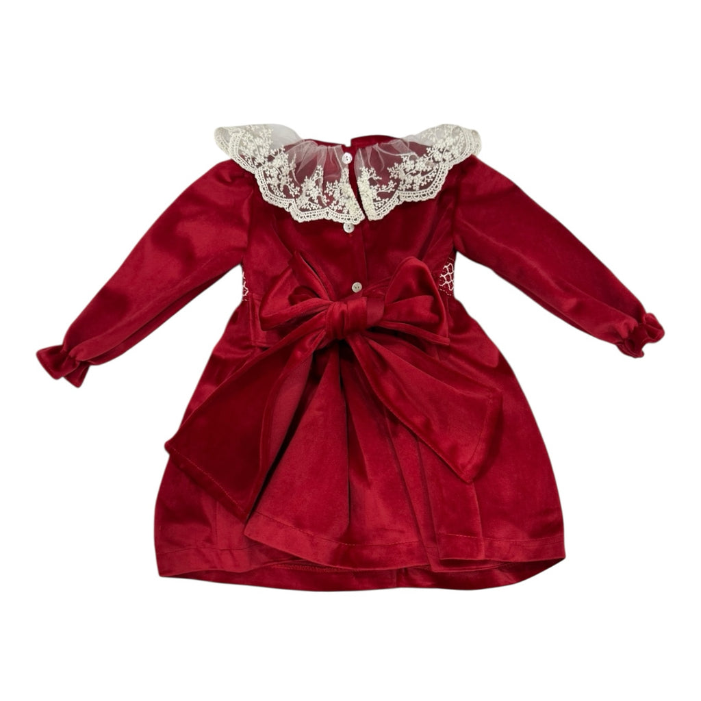 Beautiful red velvet dress for girls made with a red velvet fabric with white lace details in the neckline, ties with sashes on a bow in the back