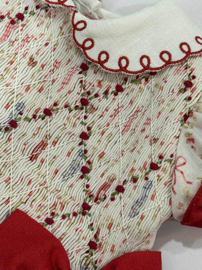 Stunning handsmocked dress, with a statement collar, handsmocked in the bodice with little flowers, crafted in a picnic linen fabric.