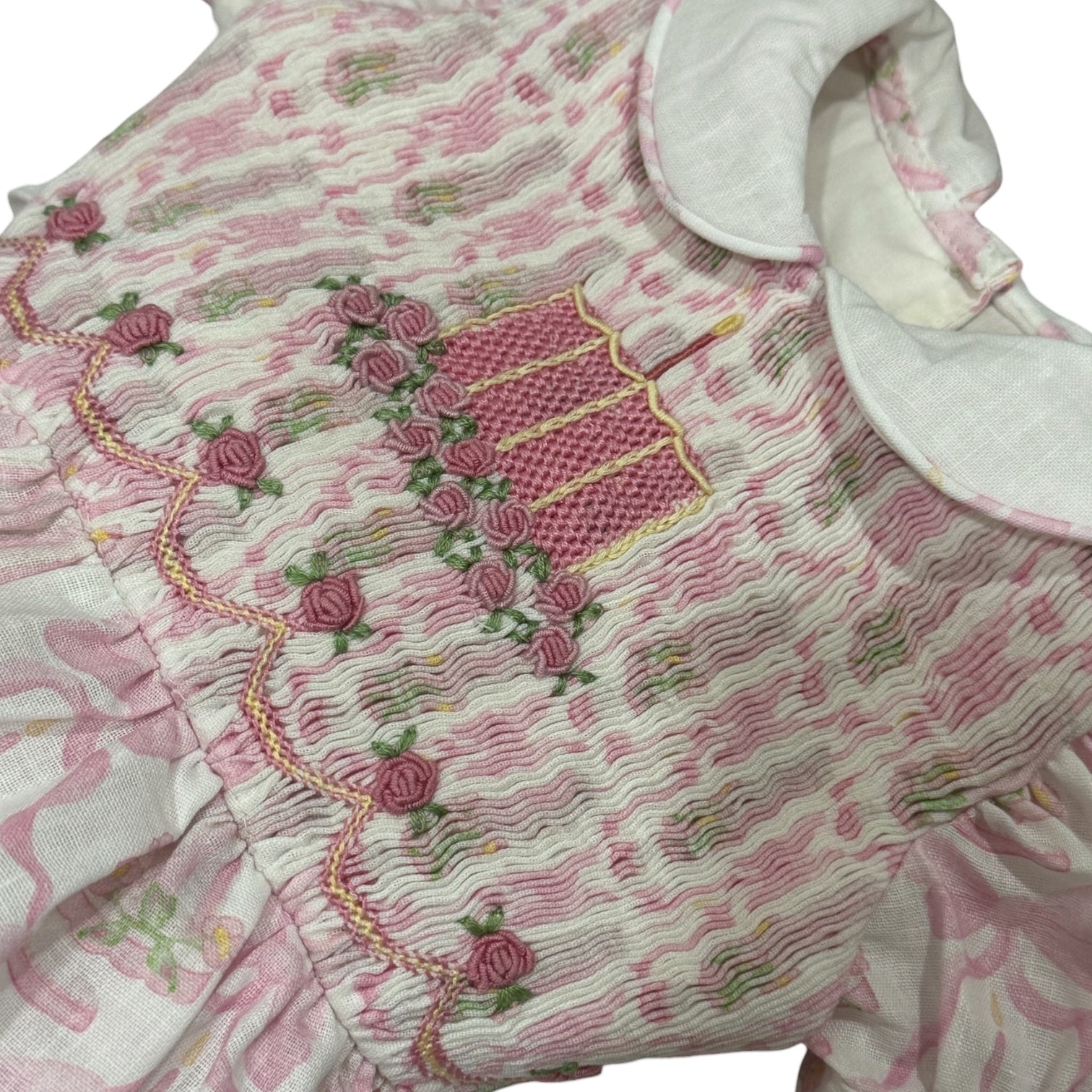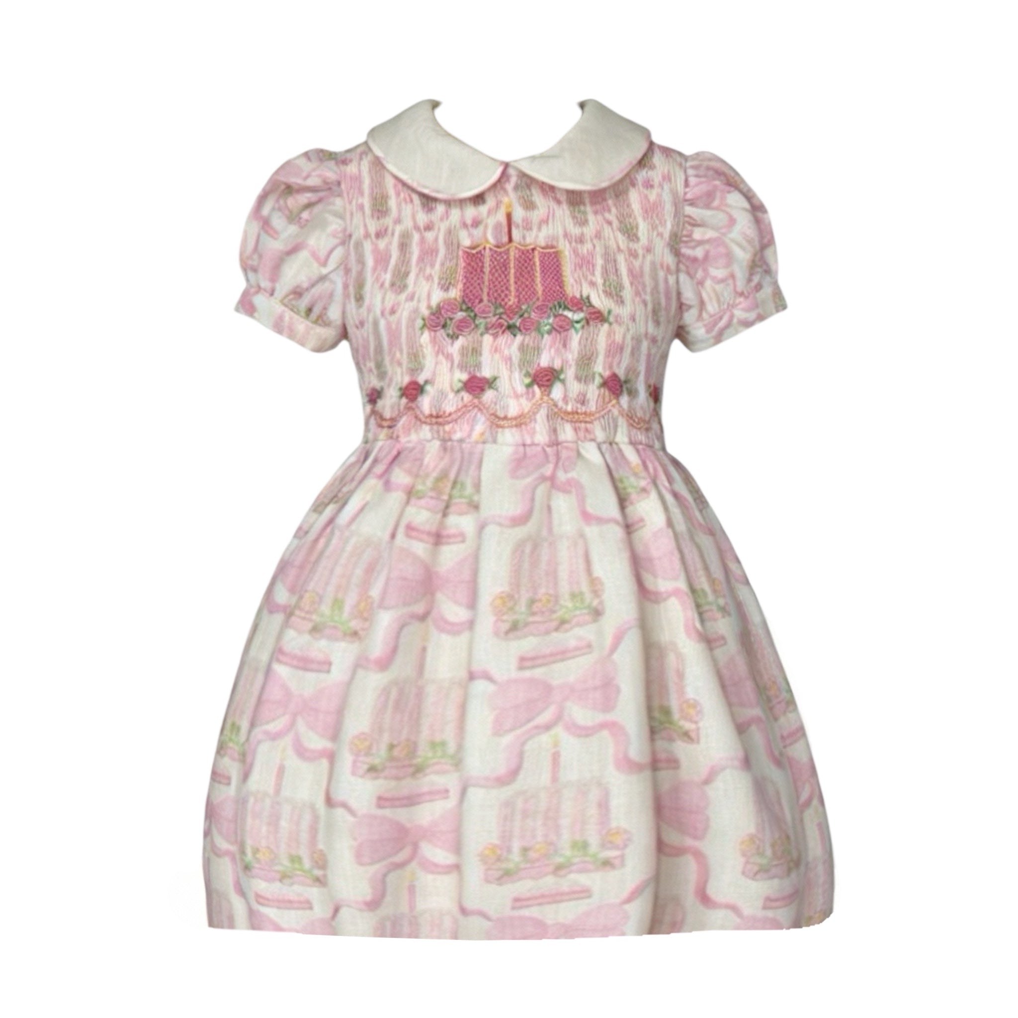 Stunning dress made of a Birthday and Bows linen fabric, with a handsmocked cake and flowers in the bodice.