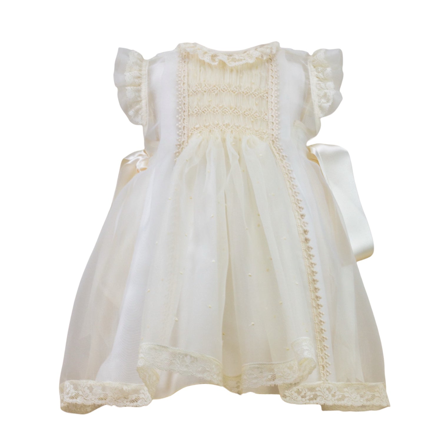 Adorable ivory dress for baptisms, or any special day. The dress has wonderful lace details all throughout, two ivory satin bows on the sides, and it is handsmocked in the center of the top part. It comes with a matching bonnet with the same lace details. Handmade by artisans in Spain.