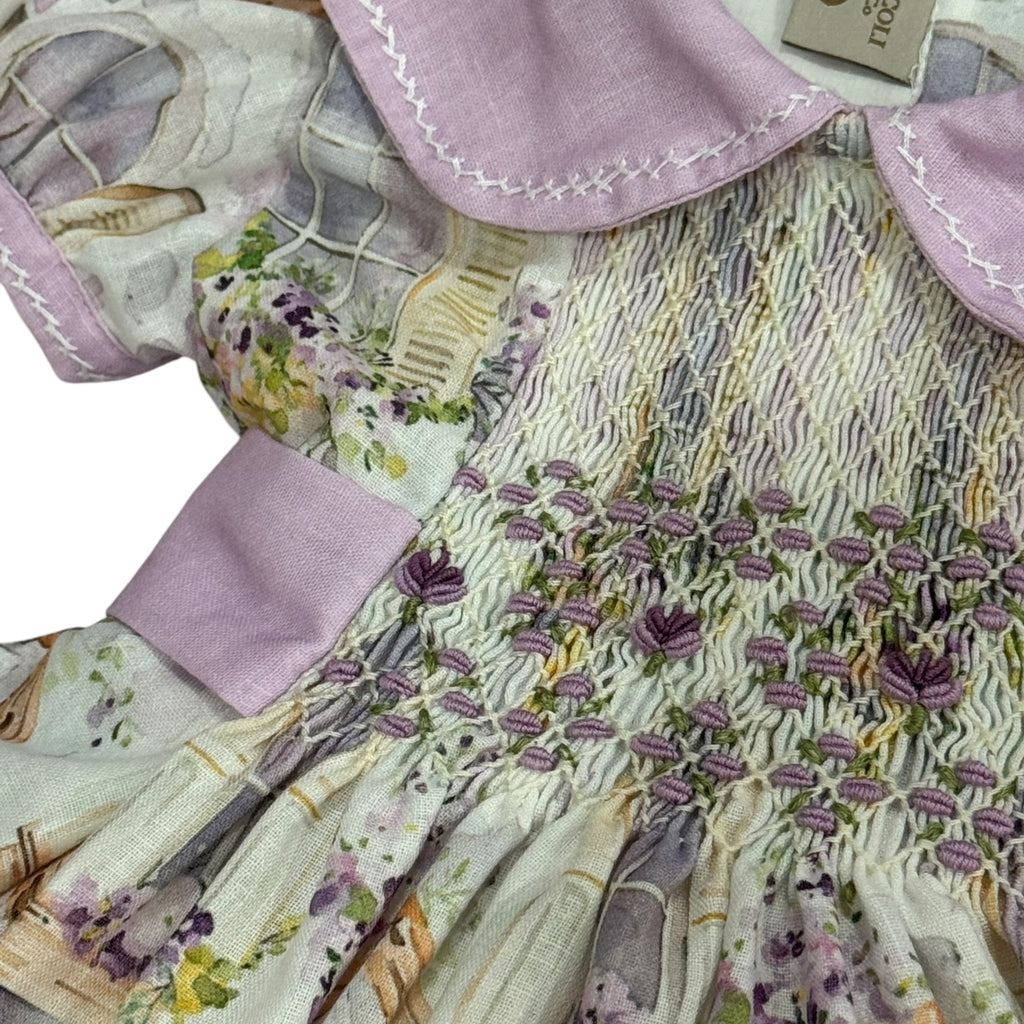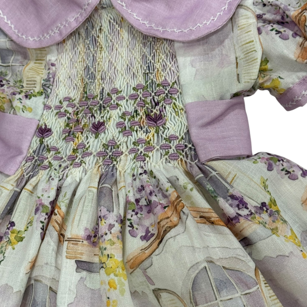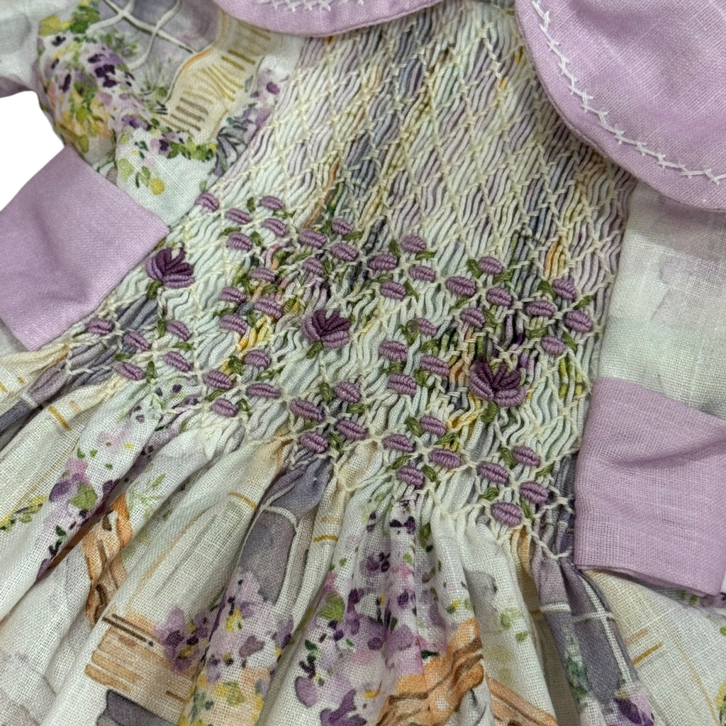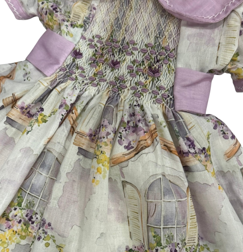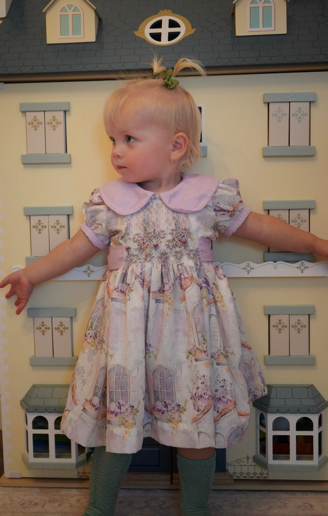 Precious dress handsmocked in the center of the bodice crafted in an adorable fabric featuring little house windows. Looks like a painting 😍
