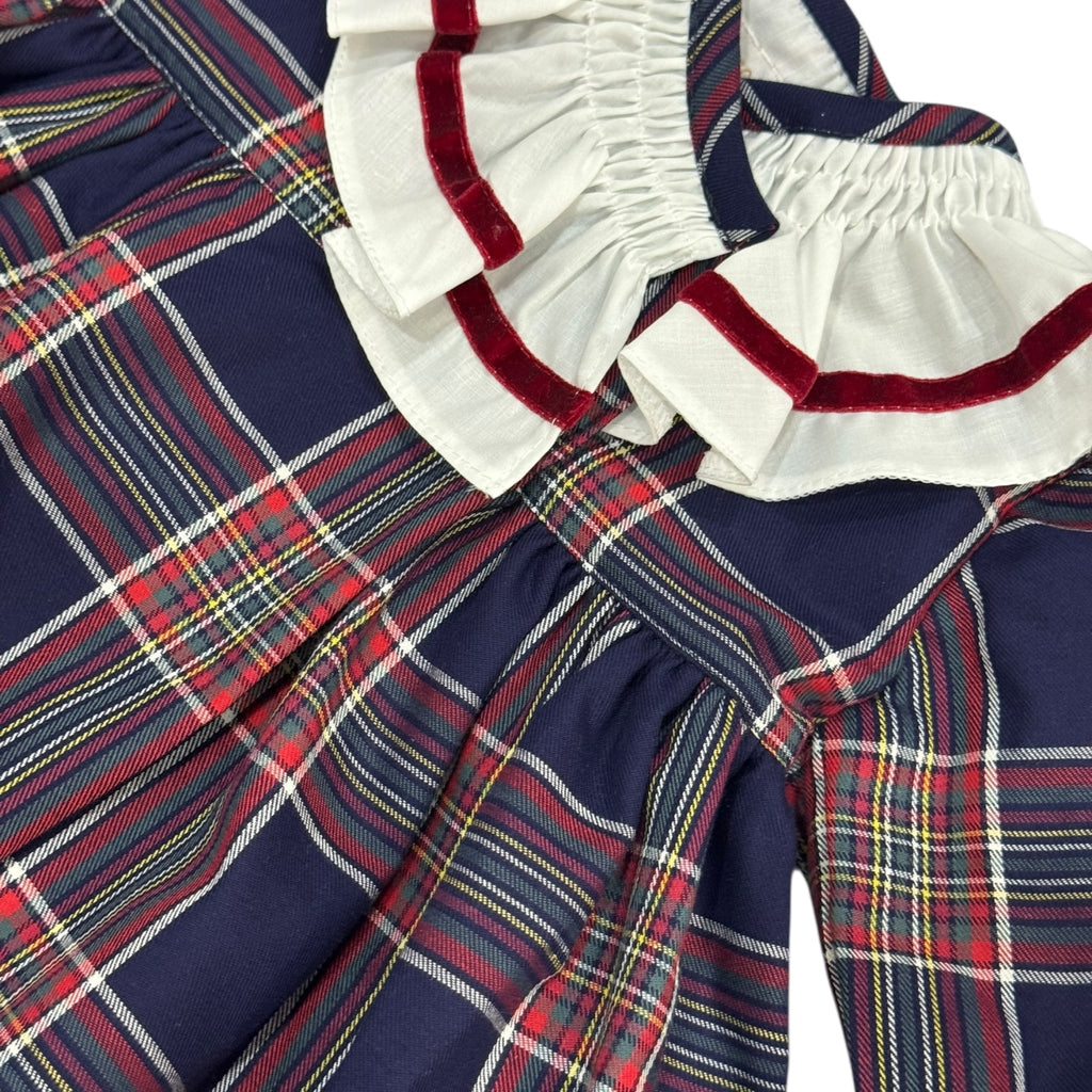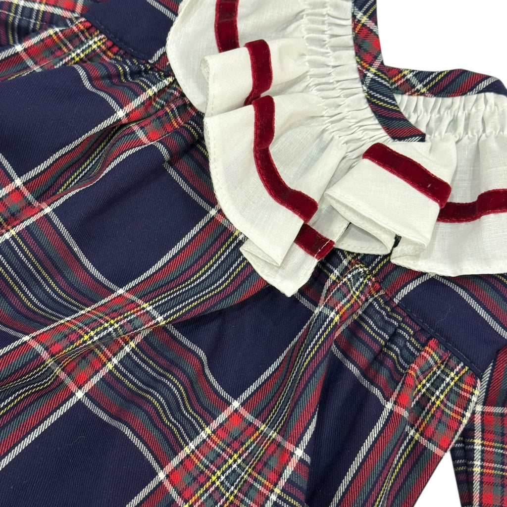 Beautiful navy tartan dress for girls made with an oversized white smocked neckline with a contrasting burgundy velvet trim.