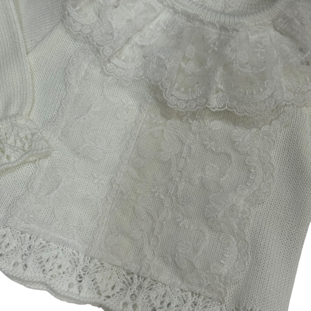 Incredibly stunning 3-piece set in white, with gorgeous lace. Set consists on top, pants, and a bonnet. This sophisticated set is composed of timelessly stylish elements, offering a luxurious blend of quality and artistry.