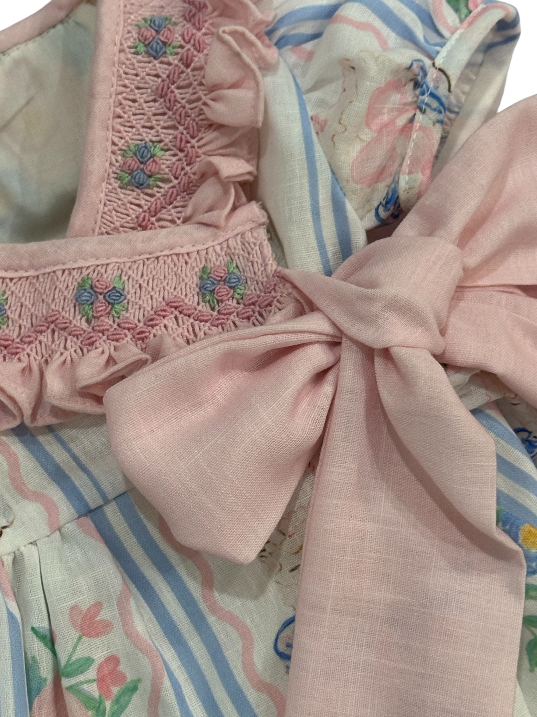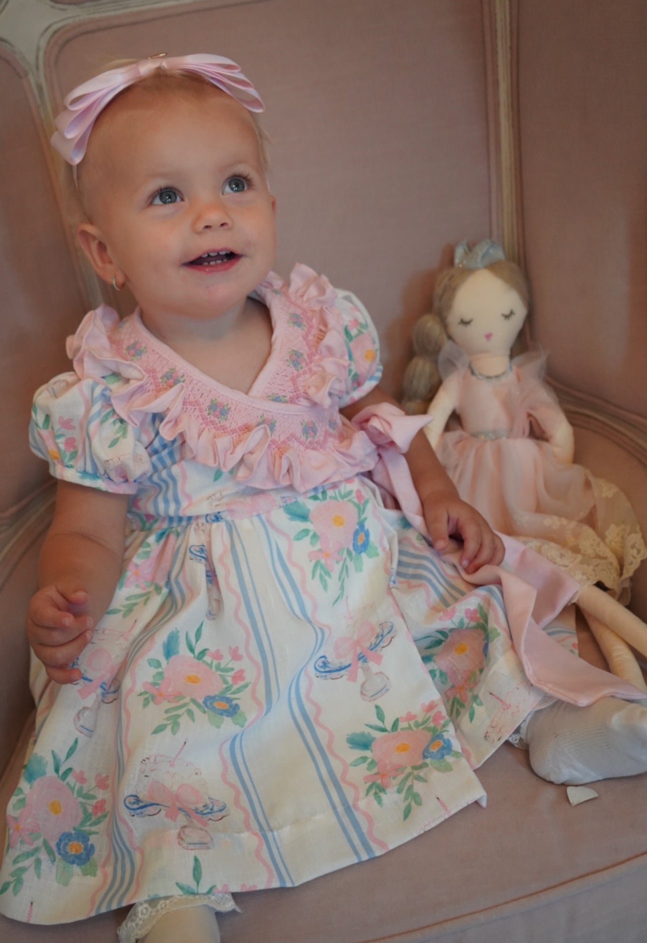 Newest edition to our Birthday Edit. Experience the most perfect Birthday dress exclusively offered at Piccoli&Co. This exquisite dress features elaborate handsmocked embellishments on the neckline, complemented by an XL pink bow on the side. Designed for girls who value both style and comfort.