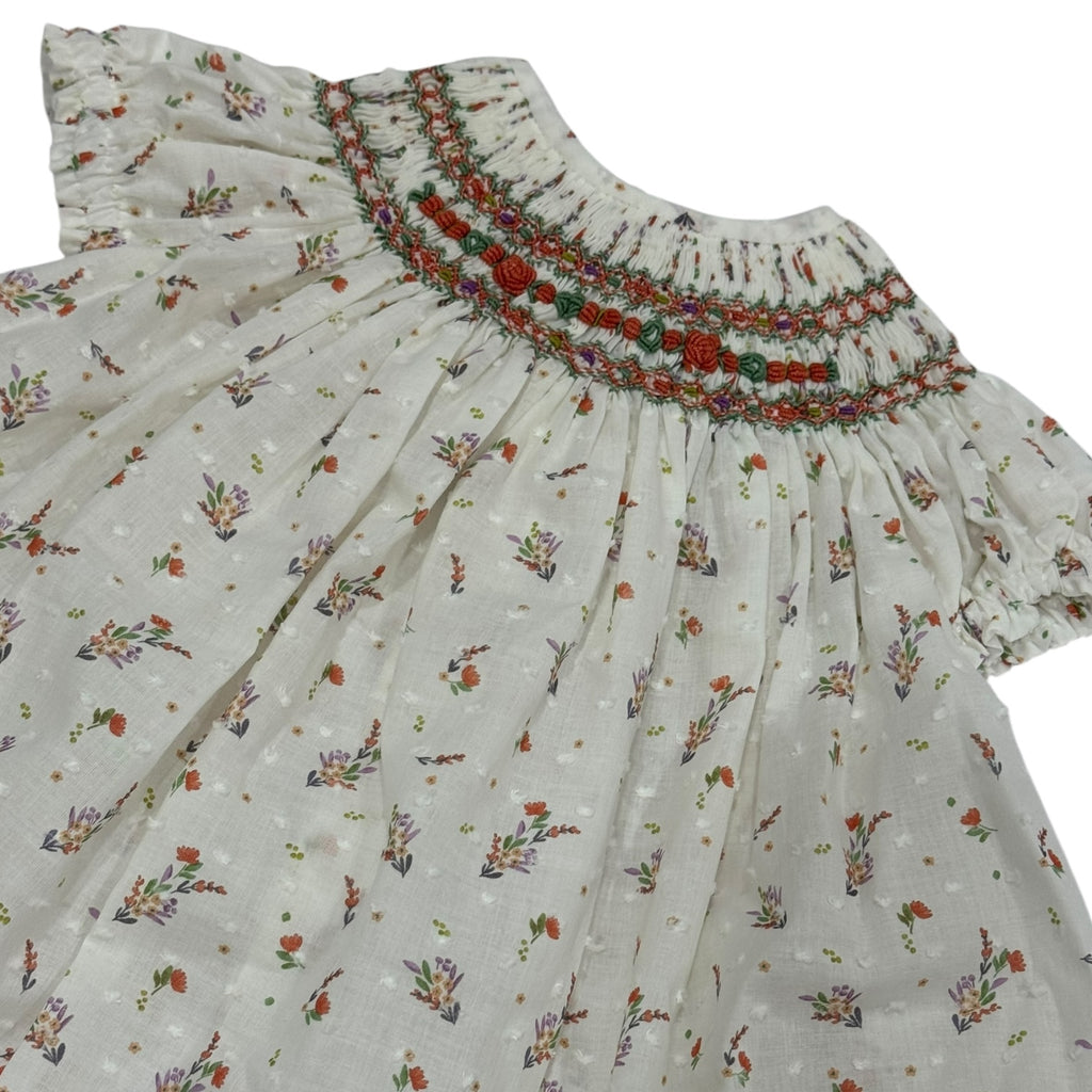 Beautiful white plumetti floral handsmocked dress with elasticated sleeves and with smocked flowers in orange, green, and purple colors.