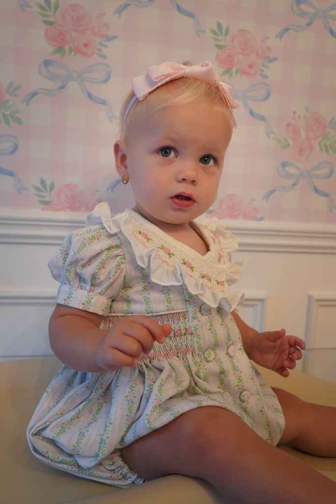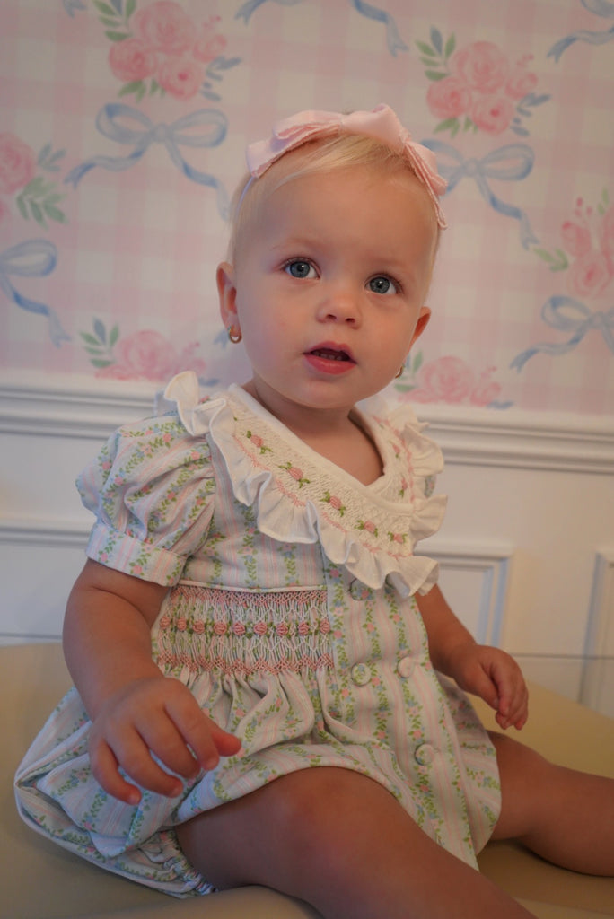 Stunning romper EXCLUSIVELY sold at Piccoli&Co. Beautifully adorned with handsmocking around the bodice and neckline showcasing the artistry of skilled artisans.